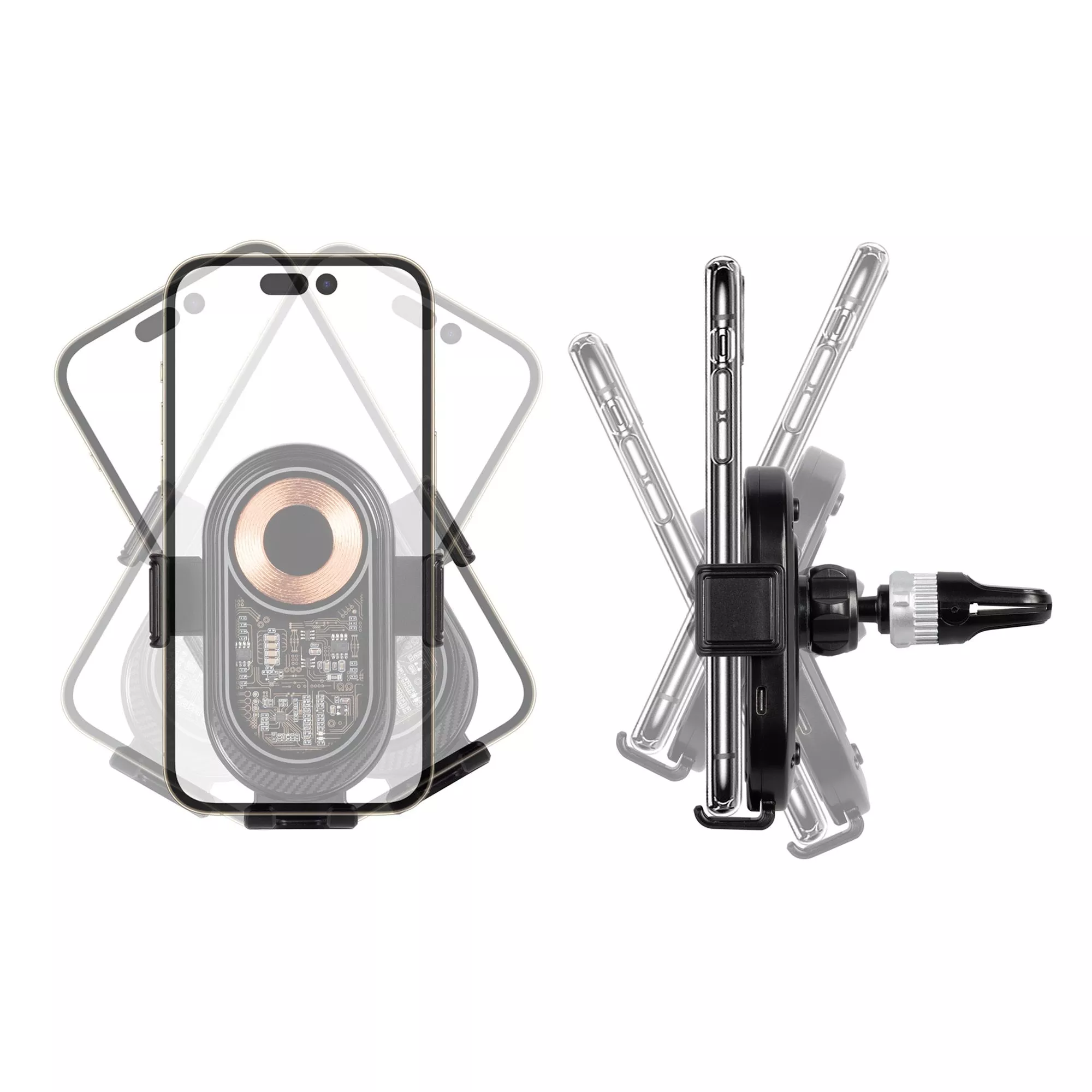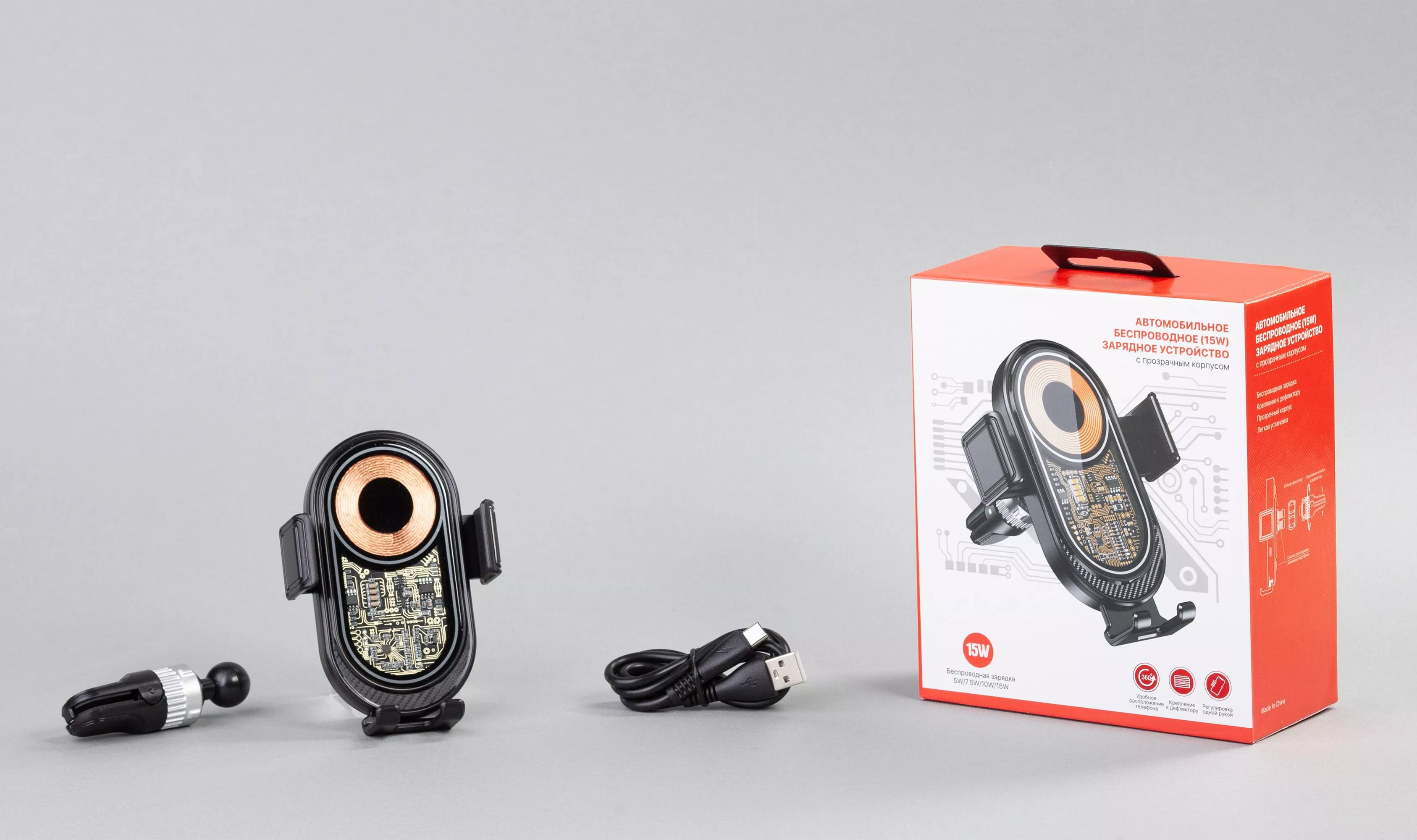 Устройство 2-в-1 в ярком трендовом прозрачном корпусе-скелетоне – автомобильный держатель для телефона + быстрое (15W) беспроводное зарядное устройство. Благодаря поворотному кронштейну можно настроить необходимый угол обзора экрана смартфона.