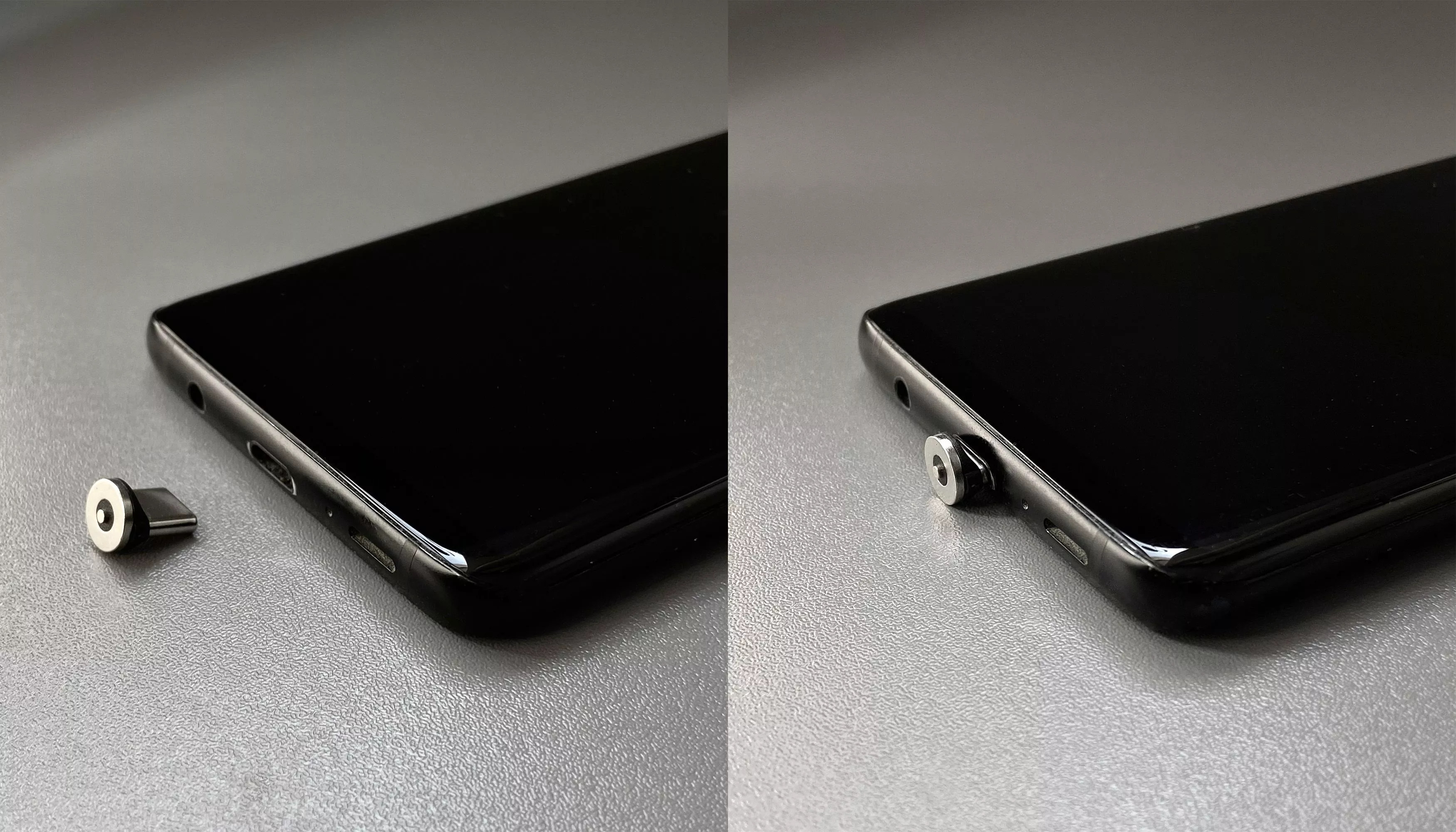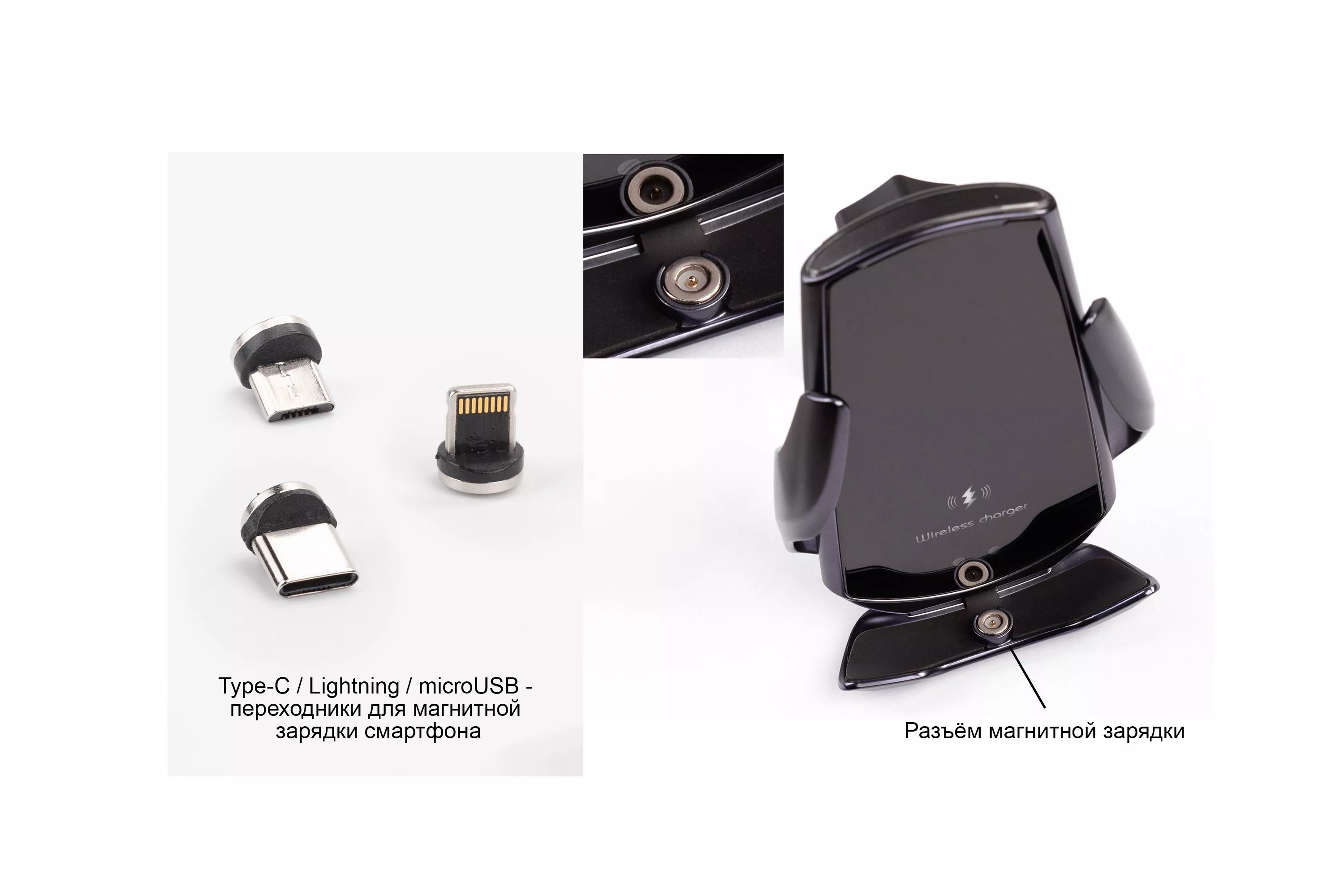 Набор переходников и разъём в нижней подставке устройства позволяют заряжать беспроводным (магнитным) способом любые смартфоны вне зависимости есть у них функция беспроводной зарядки или нет. Нужно просто вставить в зарядный разъём Вашего смартфона подходящий переходник - Type-C, Lightning или MicroUSB - и при установке смартфона в устройство зарядка начнётся автоматически.