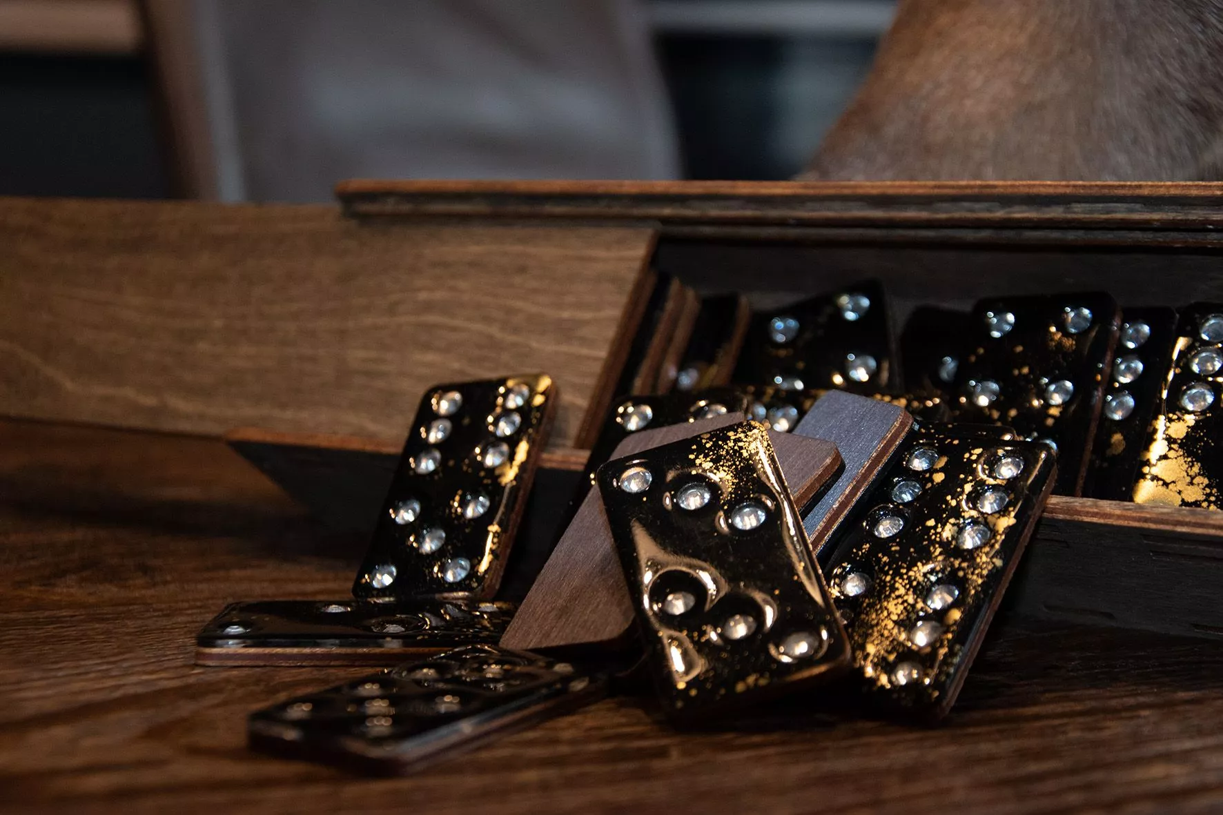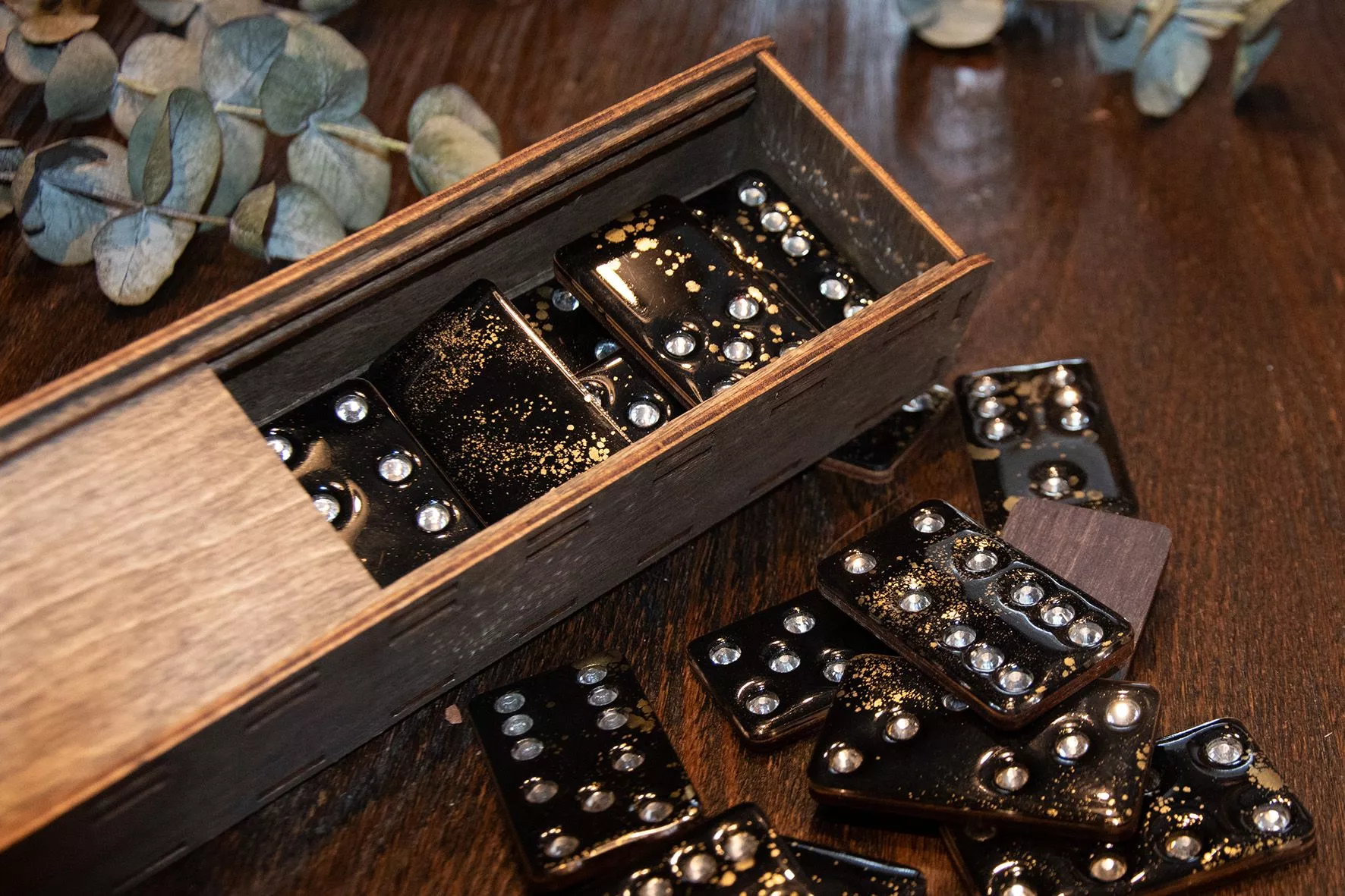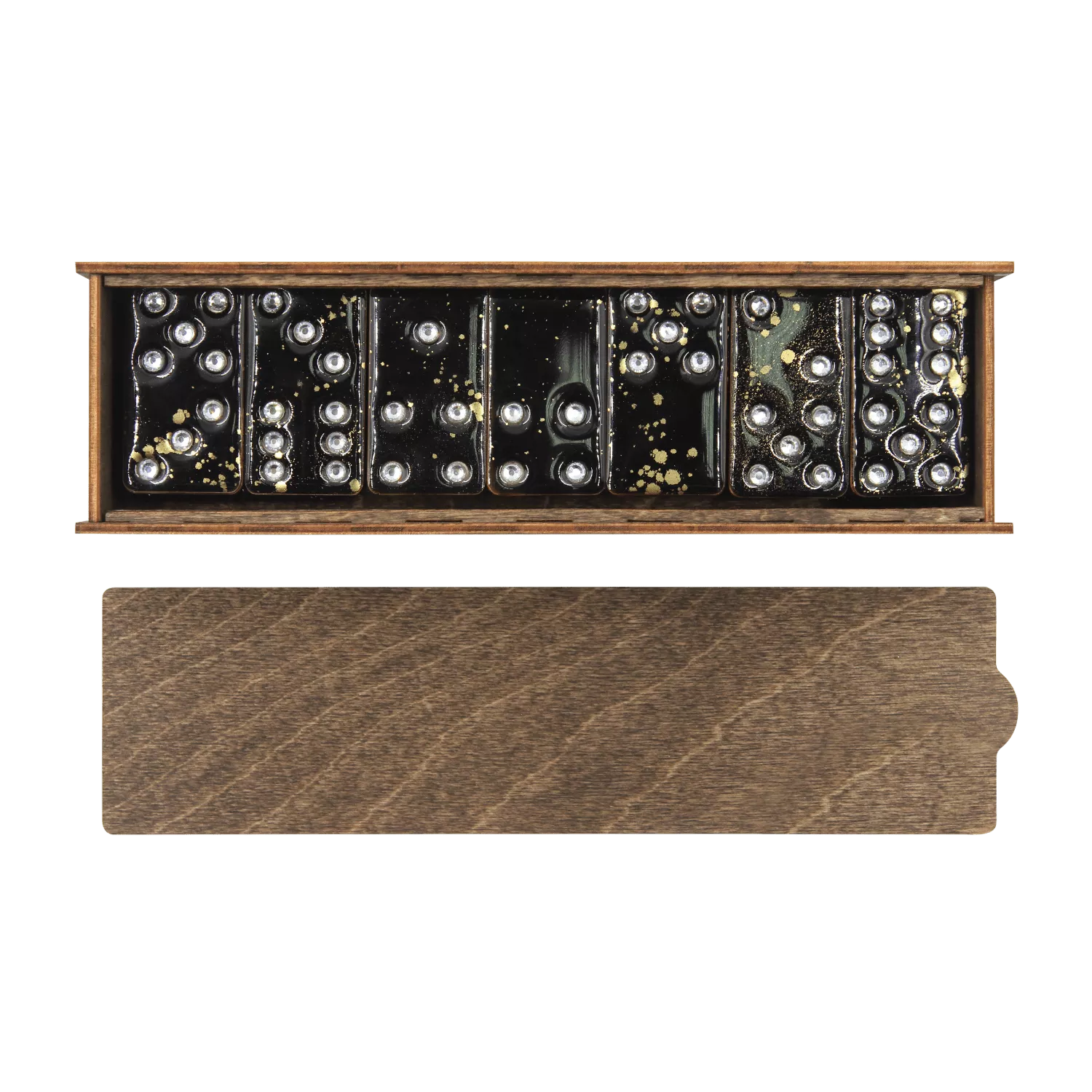 Домино WIN-WIN в стильном деревянном пенале, входит в коллекцию "Русские сезоны". Кости глянцевого черного цвета из дерева и ювелирной смолы с золотыми вкраплениями и стразами произведены вручную. Элегантный и лаконичный дизайн.