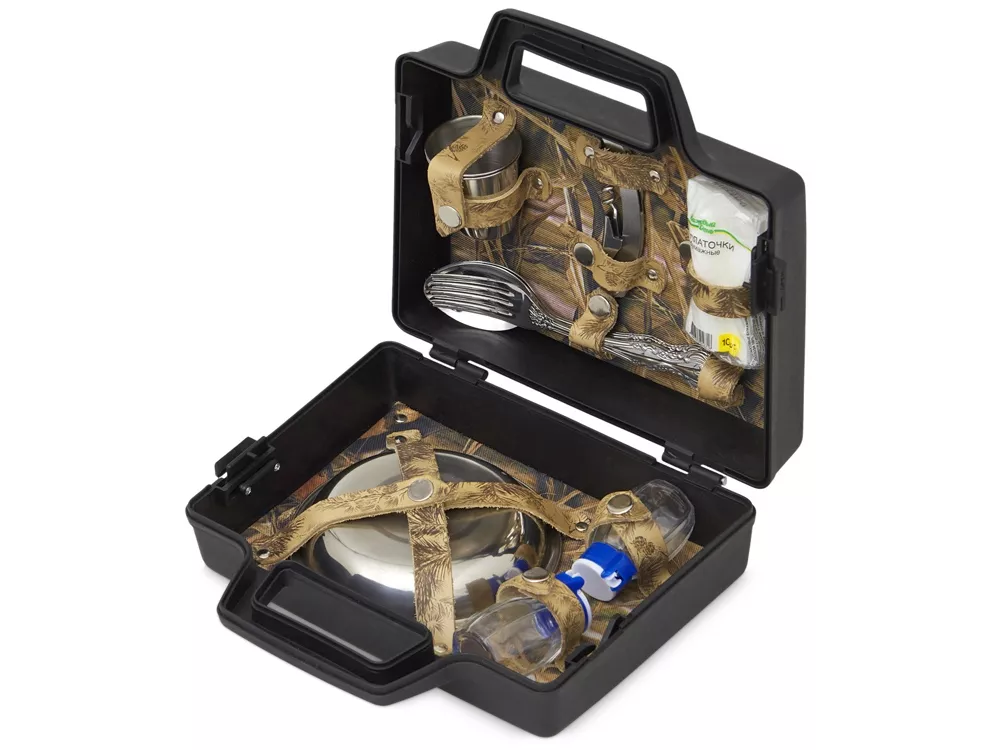 Все аксессуары упакованы в пластиковый кейс и надежно закреплены ремешками из натуральной кожи, что обеспечивает удобство транспортировки и сохранность содержимого.