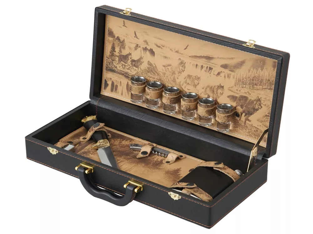 Все аксессуары упакованы в кейс из сплит-кожи, внутренняя отделка натуральная кожа с художественным выжиганием. Каждое изделие уникально, так как художественное выжигание может отличаться от представленного на фото, что придаёт набору особую индивидуальность. Все аксессуары надежно крепятся к кейсу кожаными ремешками на кнопке, обеспечивая удобство транспортировки и сохранность содержимого.