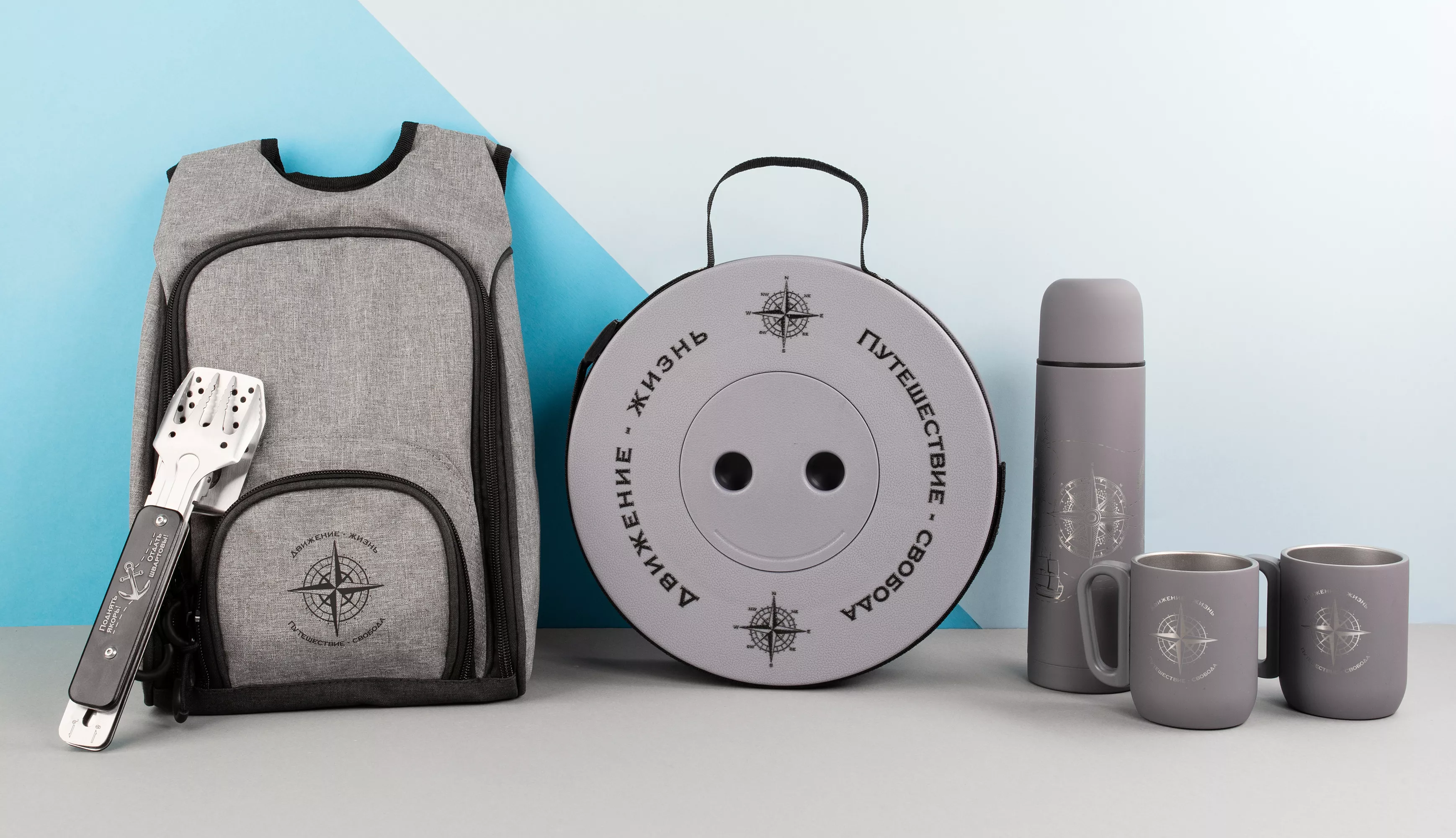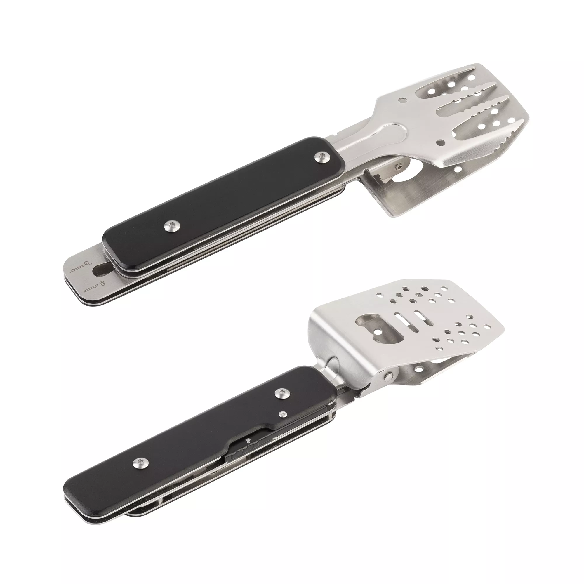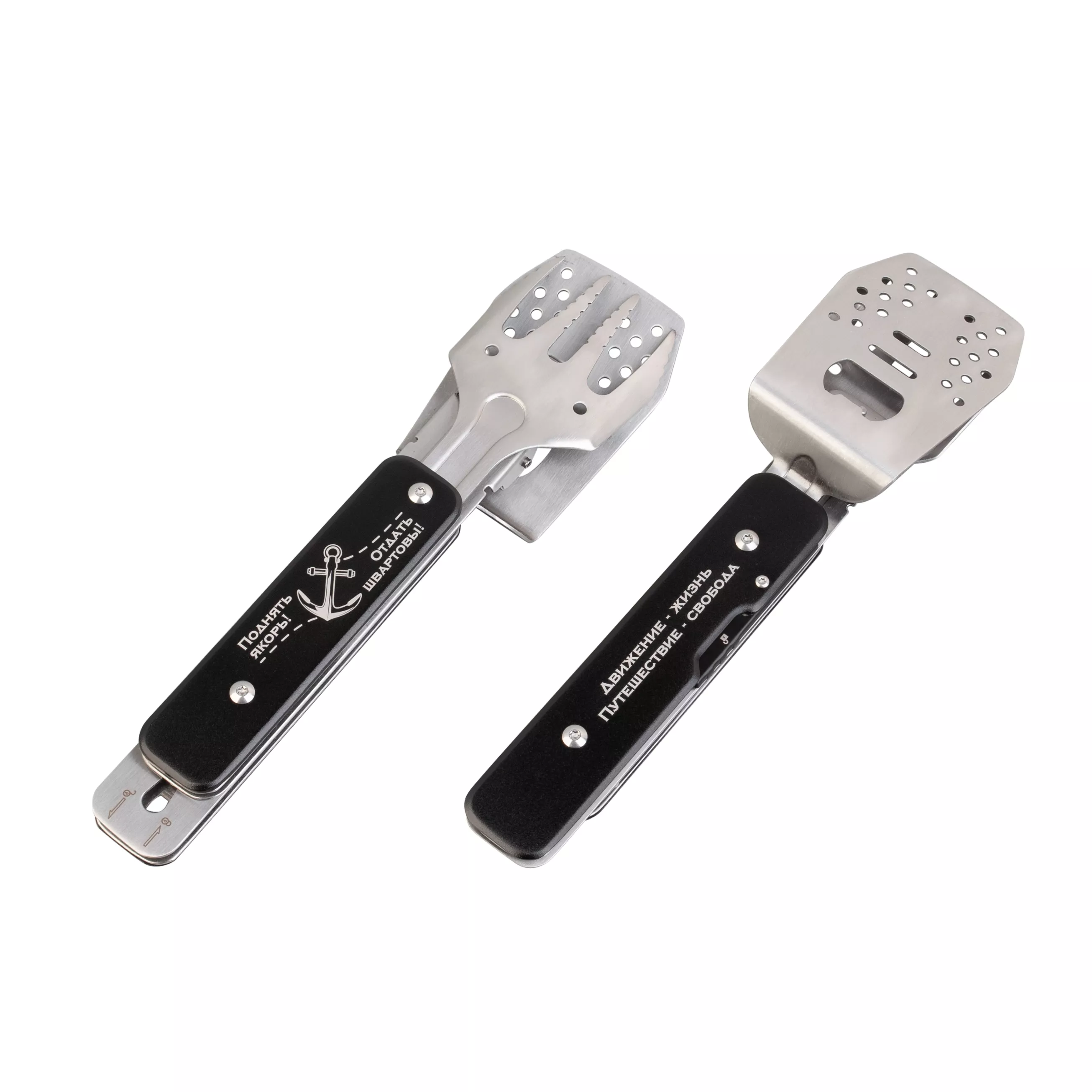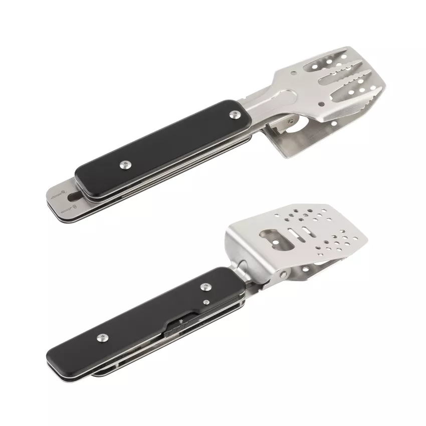 4 аксессуара: лопатка, вилка, щипцы и открывашка в одном инструменте. Размер в сложенном виде всего 6 х 22,5 х 2,6 см, в комплекте есть чехол из хлопка для хранения.