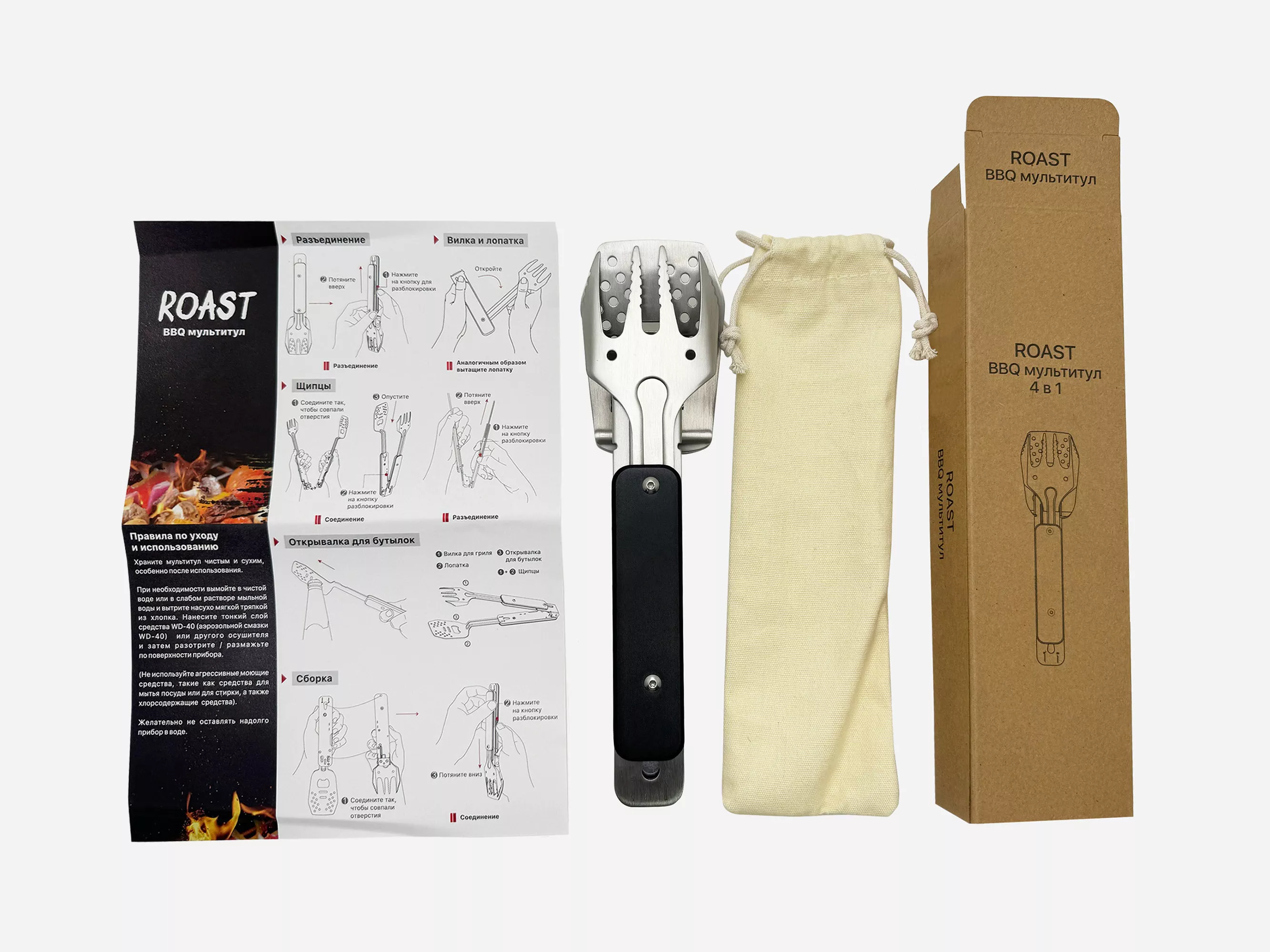 BBQ-мультитул "Roast" - незаменимый помощник для всех ценителей барбекю и гриля, позволит насладиться процессом готовки на свежем воздухе.
