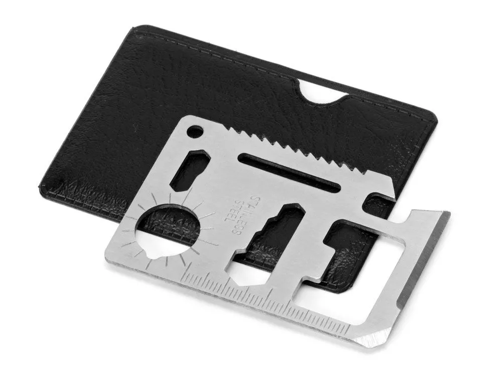 Карту можно подвесить на брелок или карабин (не идут в комплекте), продев их сквозь специальное отверстие. Для хранения прилагается специальный чехол из искусственной кожи (ПУ), который не даст острым краям мультиинструмента нанести ущерб вашей одежде или содержимому сумки, а также защитит Helper mini от загрязнений. Чехол плотно облегает мультиинструмент, имеет удобный крой и выемку для пальца, поэтому вытаскивать его удобно и легко.
