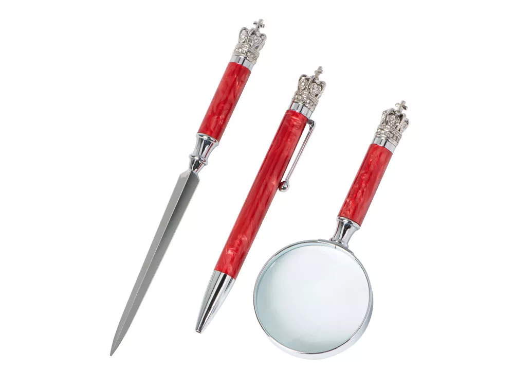 Статусный дизайн: Каждый предмет увенчан элегантной короной и украшен декором из красного перламутра.