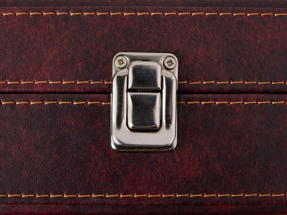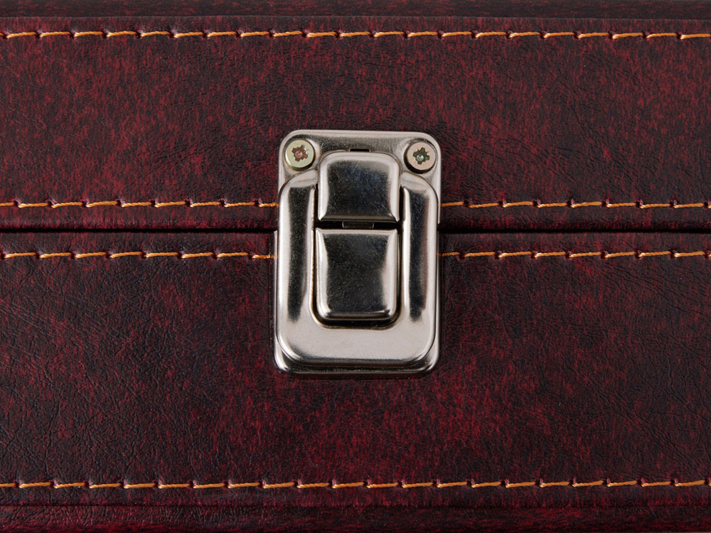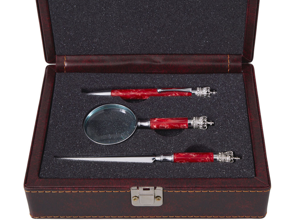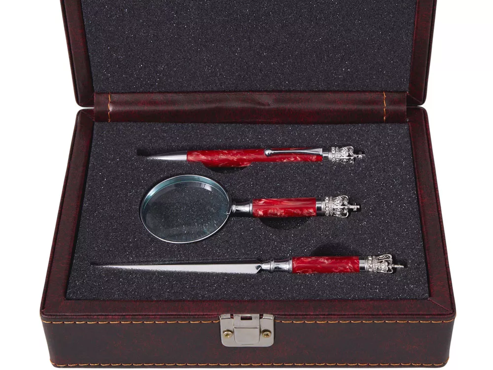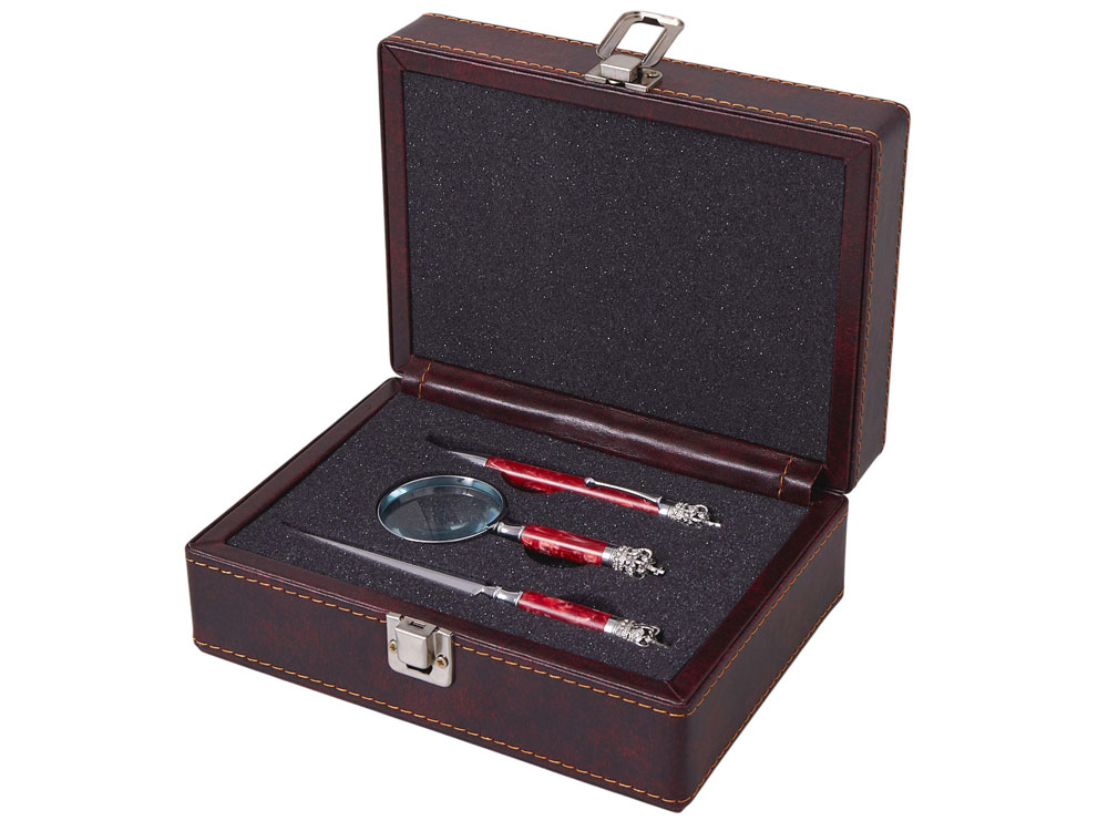 Подарочная упаковка: Набор представлен в жестком футляре из бордовой сплит- кожи с поролоновым ложементом, который гарантирует сохранность аксессуаров и подчеркивает ценность подарка.