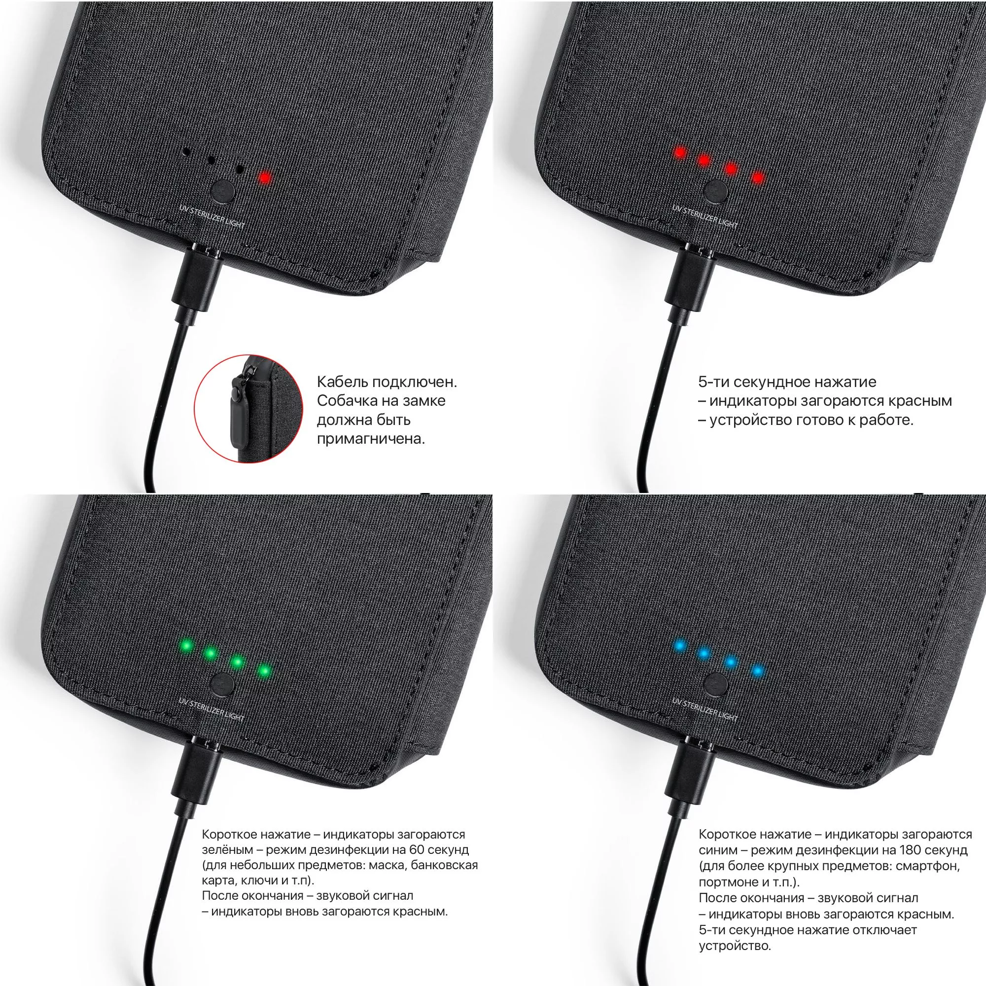 2 режима стерилизации - 1 и 3 минуты, с автоматическим отключением. В комплекте кабель Type С 100 см.