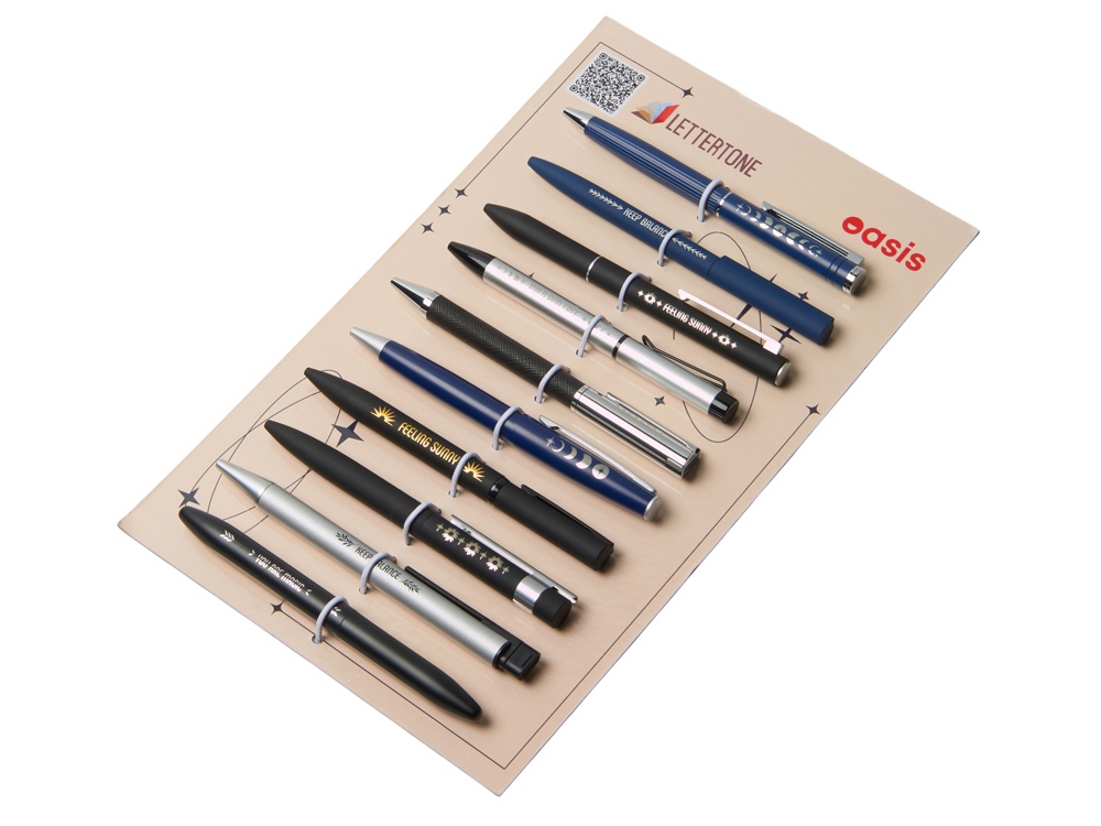 Промо-набор — идеальный инструмент для презентаций: клиенты могут подержать ручки в руках, опробовать их в деле и наглядно увидеть различия между видами нанесения. При этом все самые важные модели собраны в одном легком и компактном наборе.