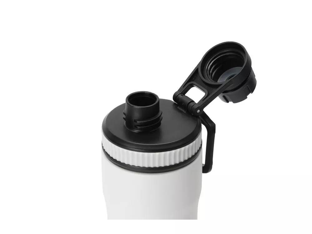 Крышка оснащена складной ручкой-держалкой, которая может быть использована для подвешивания или переноски, а также нетеряемым колпачком. Широкое питьевое отверстие позволяет быстро утолить жажду во время занятий спортом. Рельефное силиконовое кольцо по краю крышки поможет вам быстро и легко отвинтить ее от бутылки.
