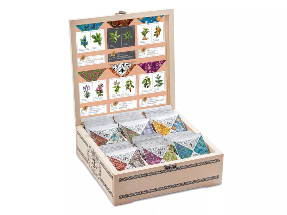 Набор многофункционален. Шкатулка с пакетиками будет эффектным и функциональным украшением вашей кухни или гостиной. В качестве чайного мини-дисплея она удобна для использования в офисе. Кроме того, набор является прекрасным подарком.