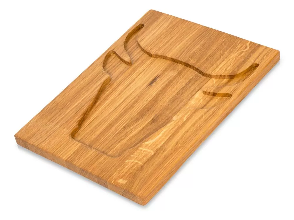 На одной из сторон имеется углубление в форме головы быка, благодаря которому сок из стейка не прольётся на стол.