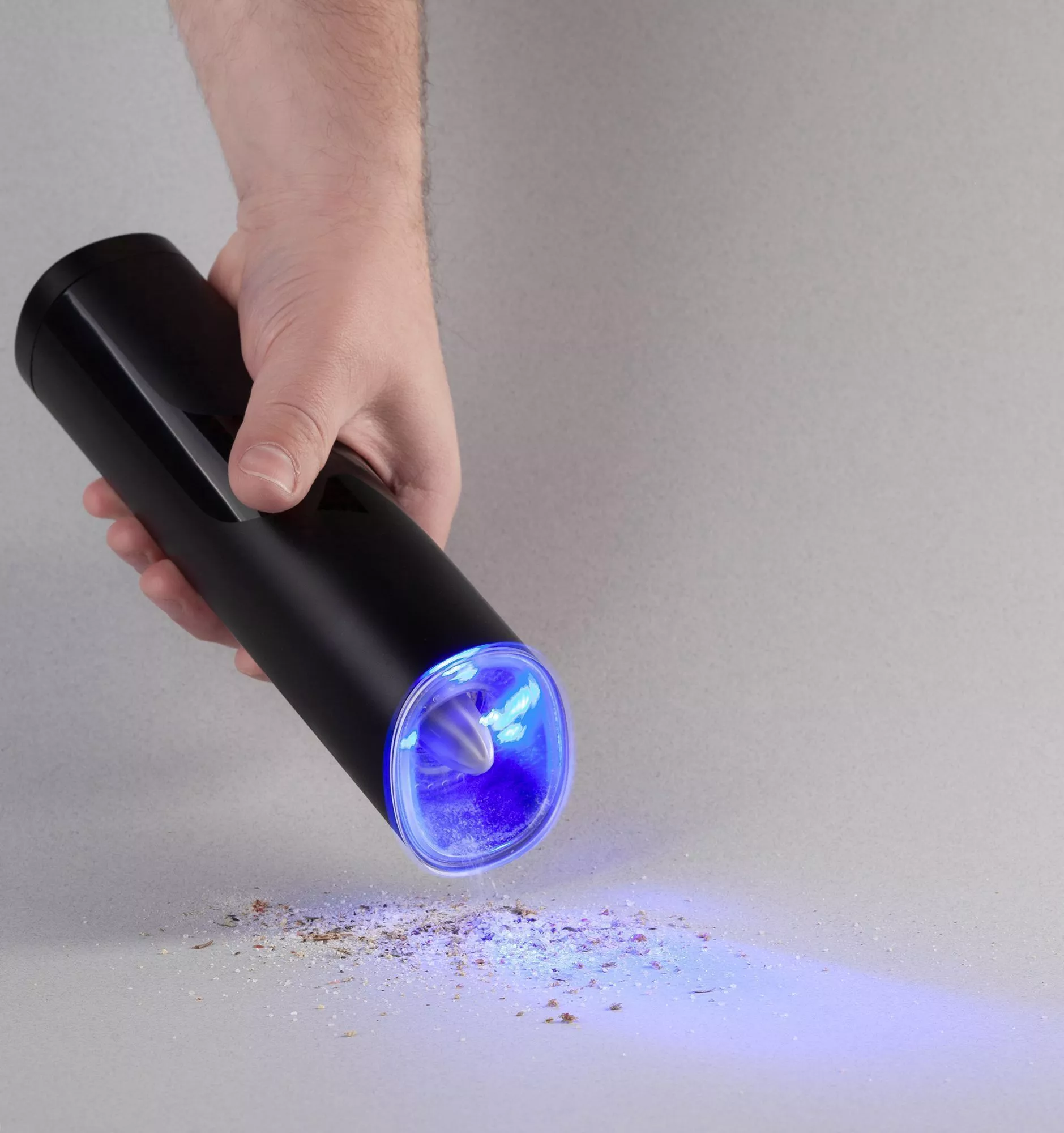 Кнопка питания позволяет быстро отключить мельницу для чистки и обслуживания устройства. Яркая синяя подсветка загорается при работе мельницы.