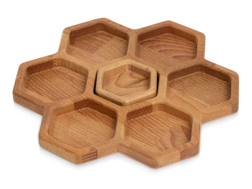 Менажница выполнена из бука и пропитана маслом, что обеспечивает изделию свежий вид. Советуем регулярно смазывать дерево пищевым маслом, чтобы изделие дольше радовало вас.