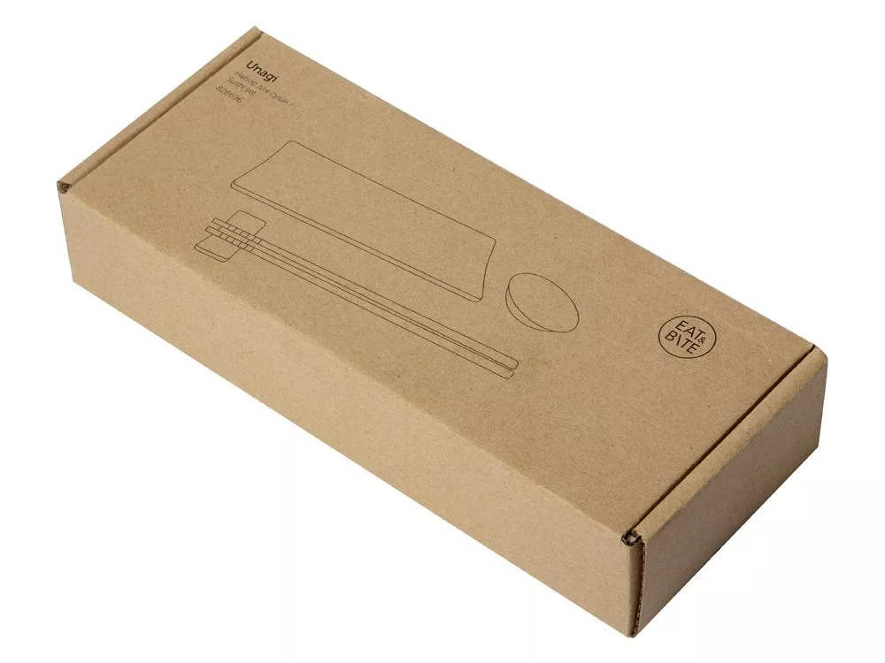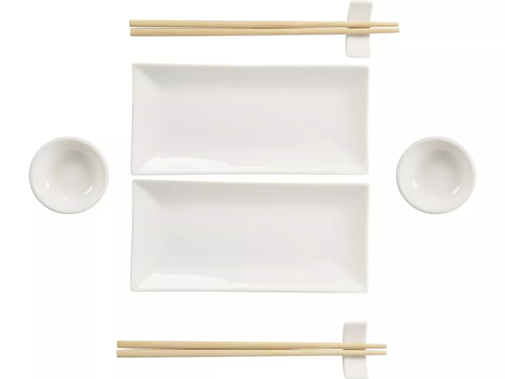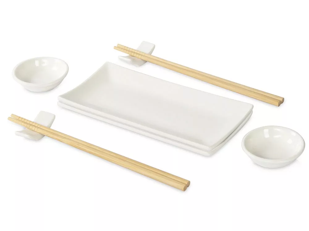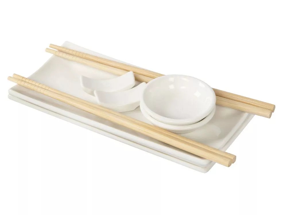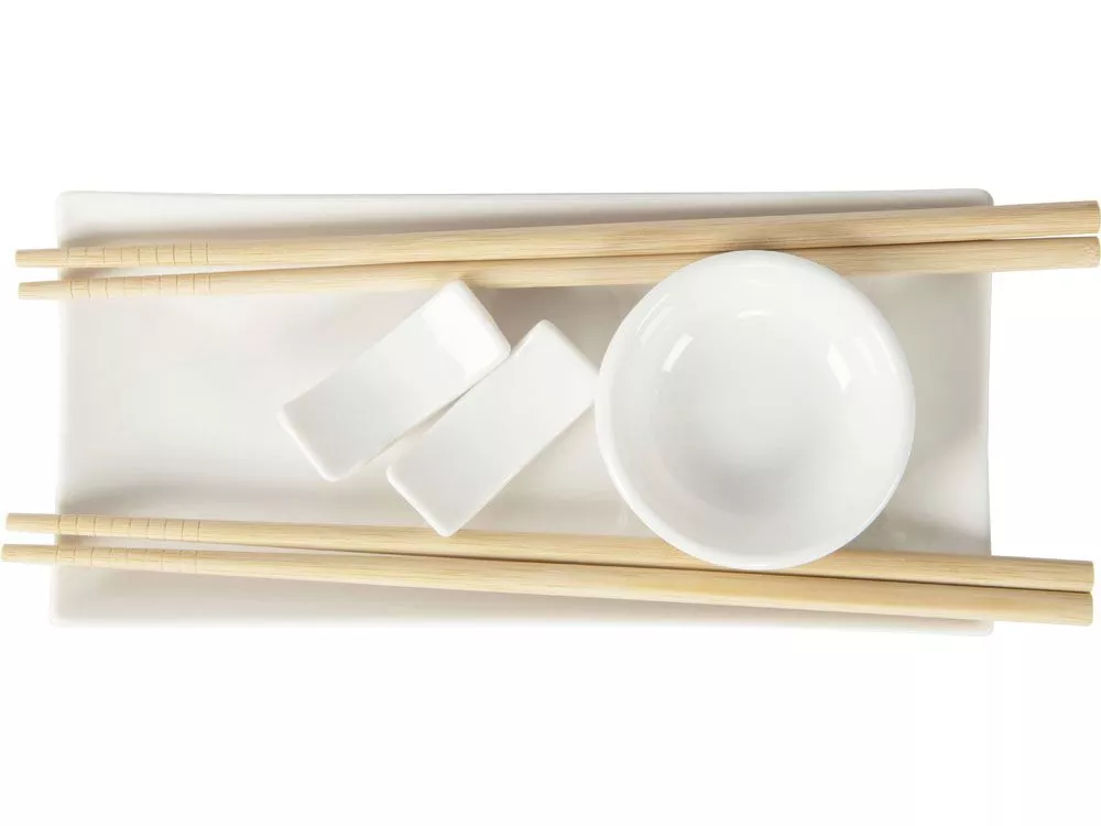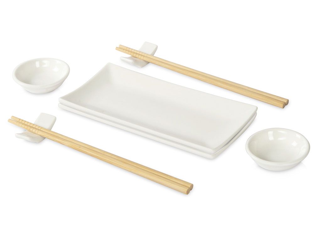 Посуда изготовлена из керамики, а палочки — из бамбука, благодаря чему они не впитывают запахи и не влияют на вкус продуктов.