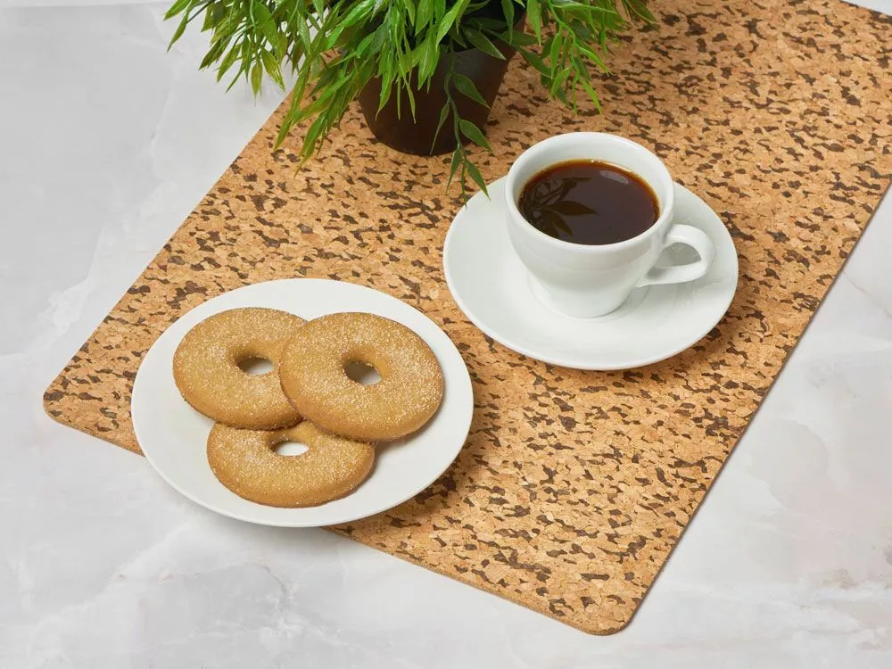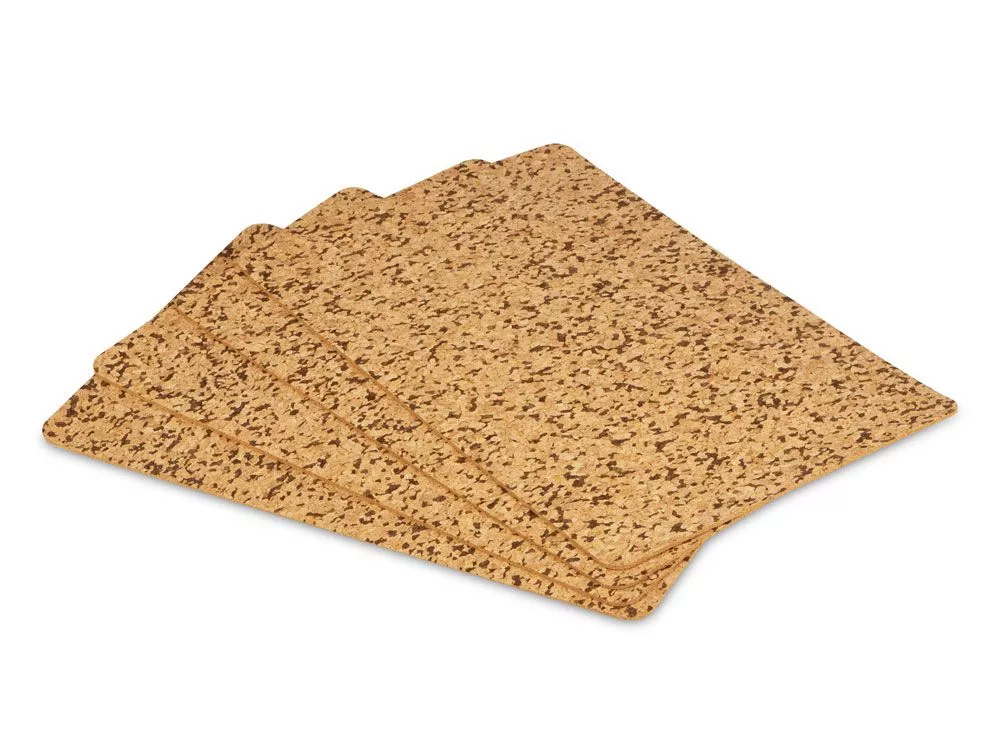 Двусторонние подставки изготовлены из пробкового дерева и имеют природный цвет и текстуру. Благодаря свойству этого материала не пропускать тепло, данный набор можно использовать и как подставки под горячее.