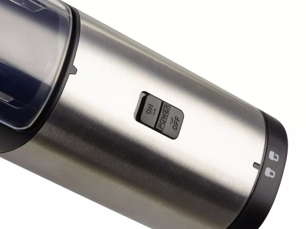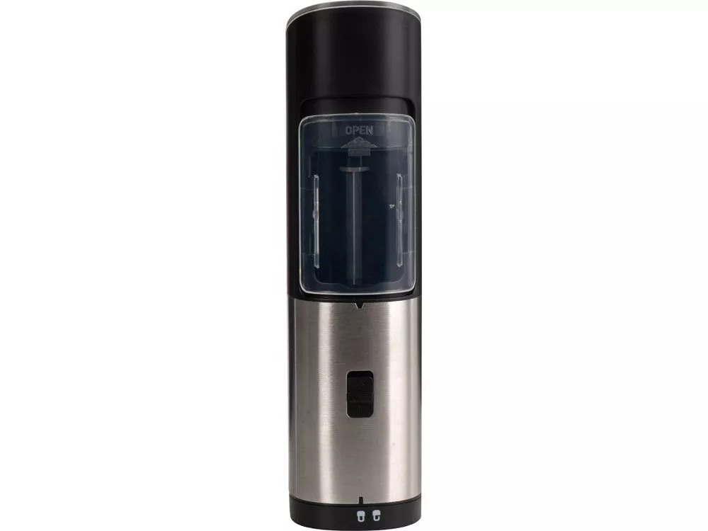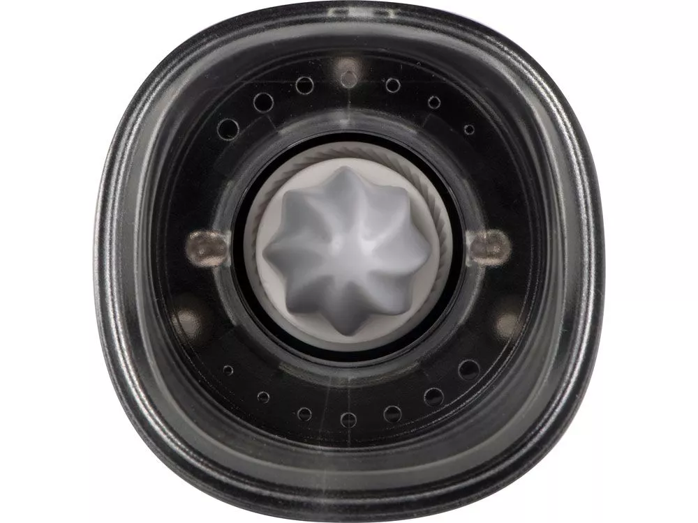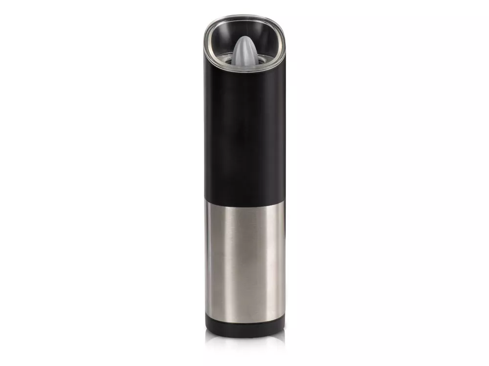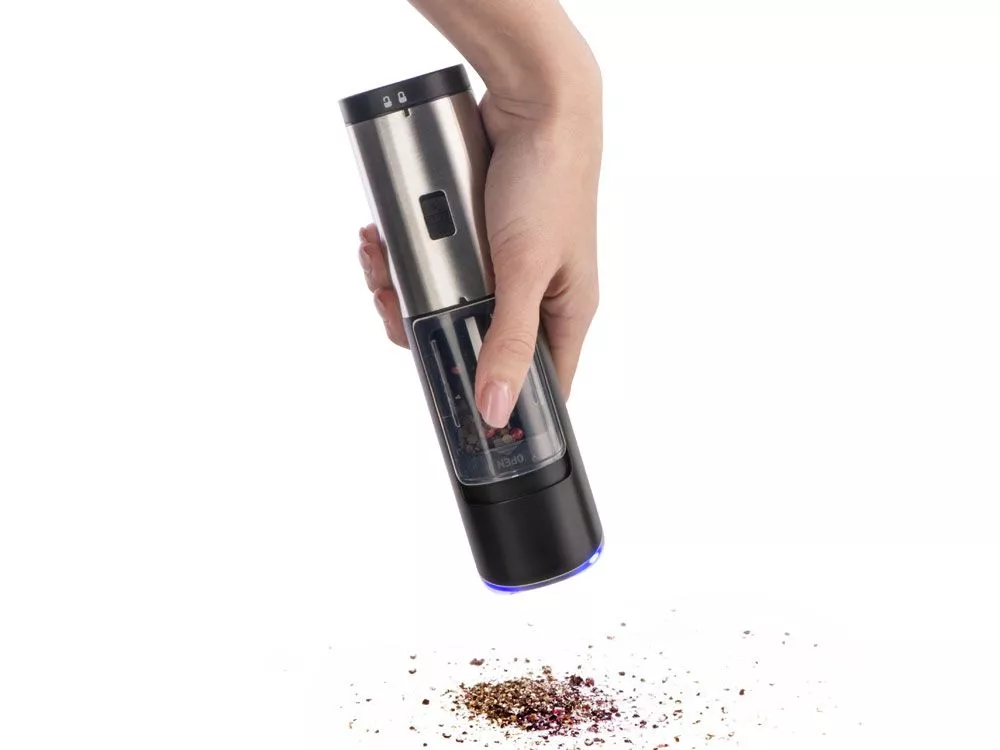 Мельница включается лишь в перевернутом положении, что позволяет снизить расход батареек и решает проблему случайного срабатывания устройства. Эргономичный корпус выполнен из нержавеющей стали и текстурного АБС-пластика.