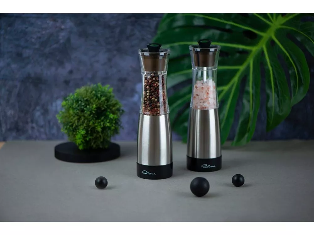 В комплект входят две мельницы, оснащенные высококачественным керамическим механизмом, который обеспечивает равномерное и эффективное измельчение специй. Приводятся в действие вручную, что позволяет легко контролировать степень помола. Изготовлены из прочной нержавеющей стали с элементами прозрачного акрила, что придаёт набору современный и элегантный вид.