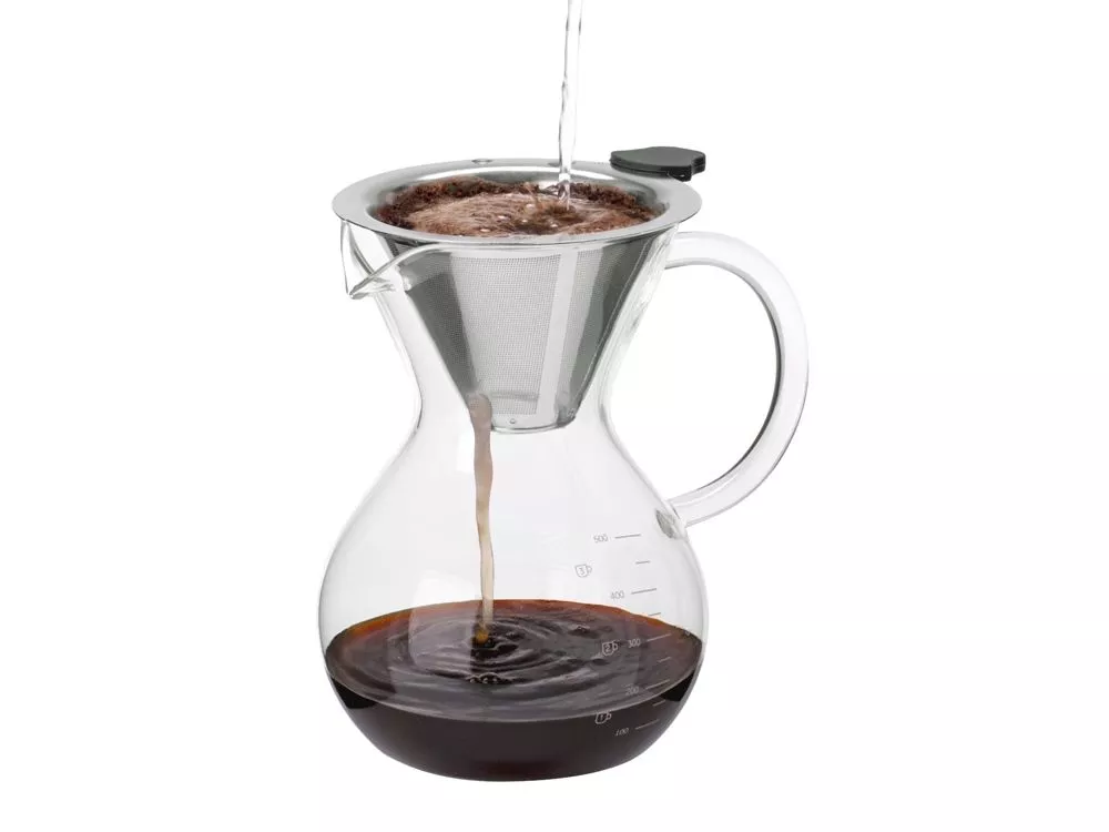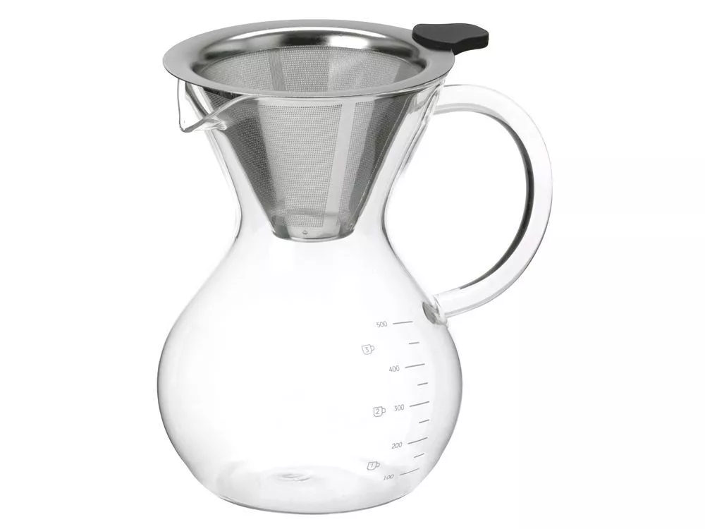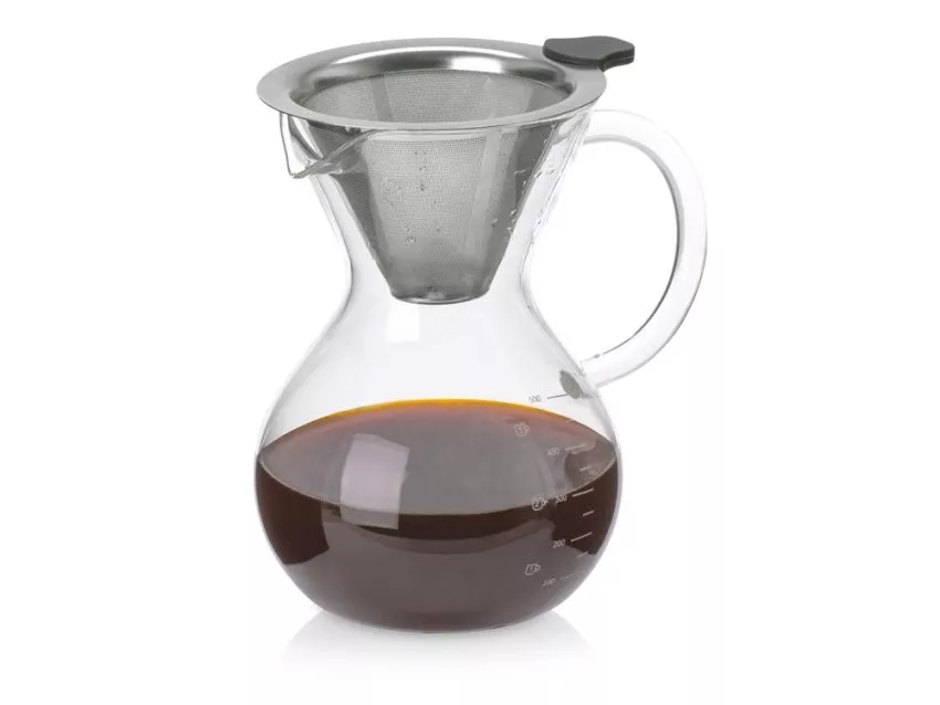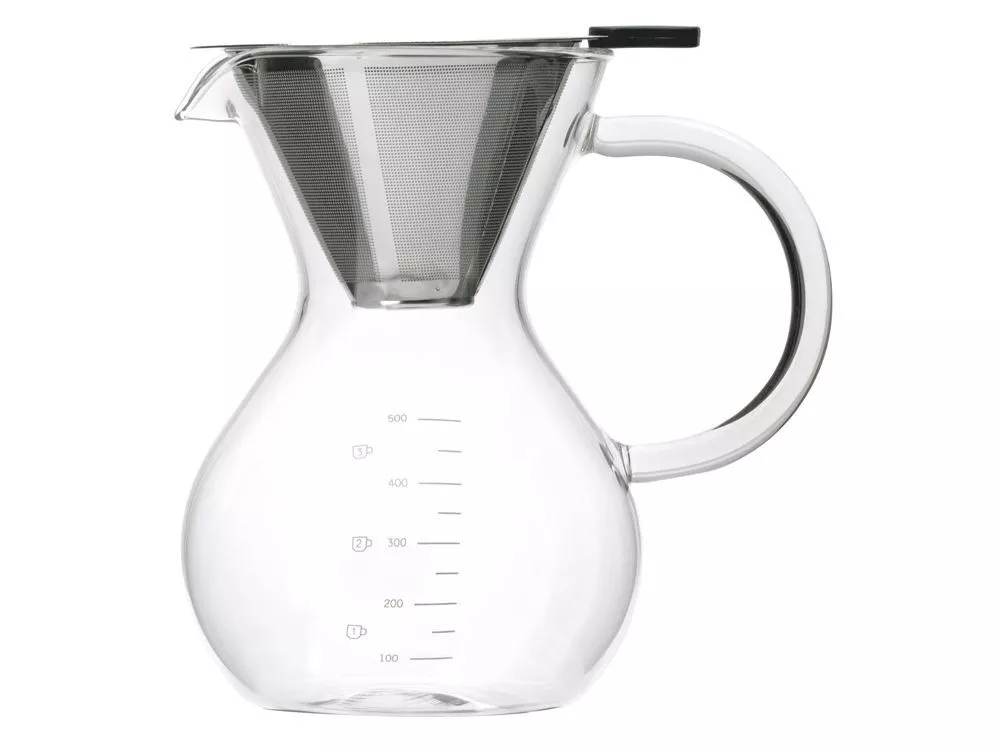 Большой объём позволяет заварить до 500 мл кофе за раз — это две стандартных порции. Жаропрочное боросиликатное стекло отлично переносит перепады температуры, а удобная ручка не нагревается, поэтому можно сразу разливать горячий напиток.