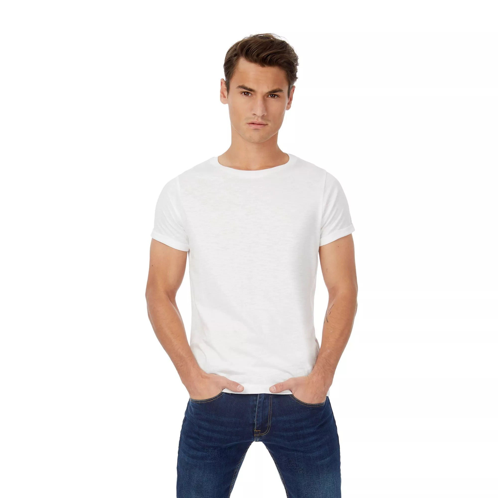 Футболка мужская, приталенная, с боковыми швами, плотностью 150 г/кв.м.; воротник с резинкой 1х1 из фасонной пряжи (slub yarn).