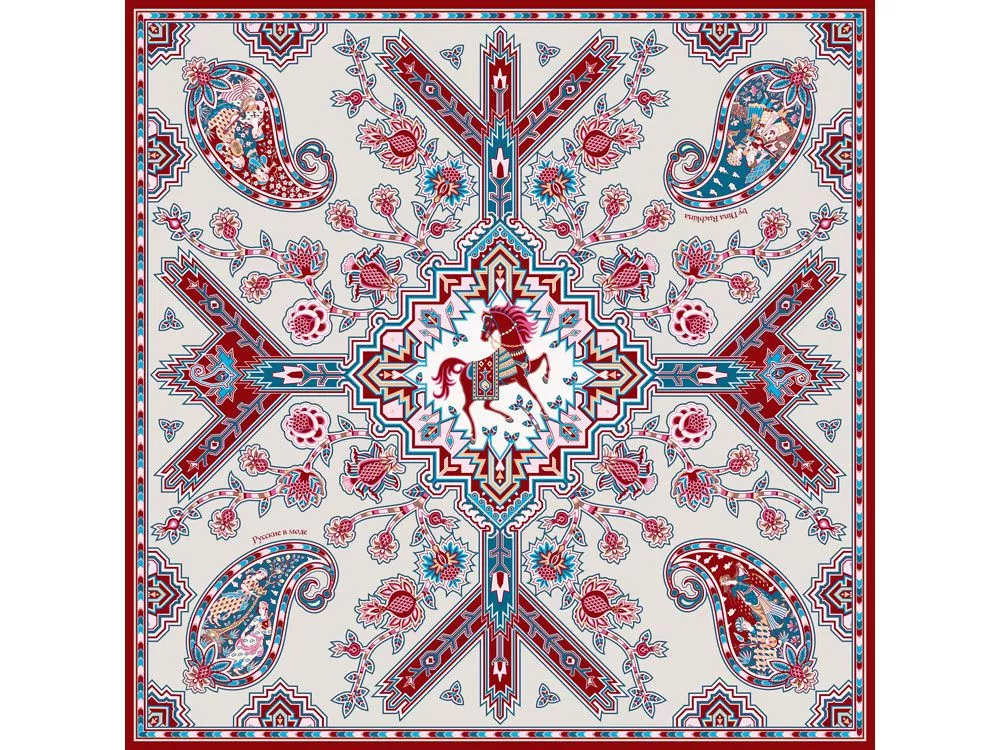 В центре принта аксессуара изображена гордая лошадь - один из главных символов величественного Кавказа, ассоциирующийся с дивной красотой, силой, смелостью и огнём.