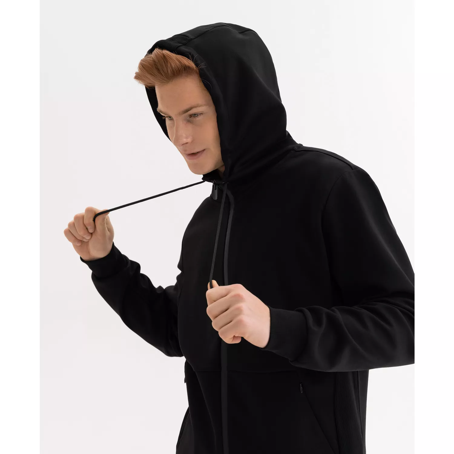 Толстовка сделана из мягкой и прочной ткани интерлок "doubleface", которая приятна к телу и легка в уходе, не растягивается, не выцветает и не деформируется после стирки. Манжеты и низ сделаны из плотной резинки 2х2, благодаря чему вещь держит форму. Карманы на потайных молниях придают толстовке аккуратный вид. Капюшон на подкладке из ткани джерси в тон регулируется шнурками.
