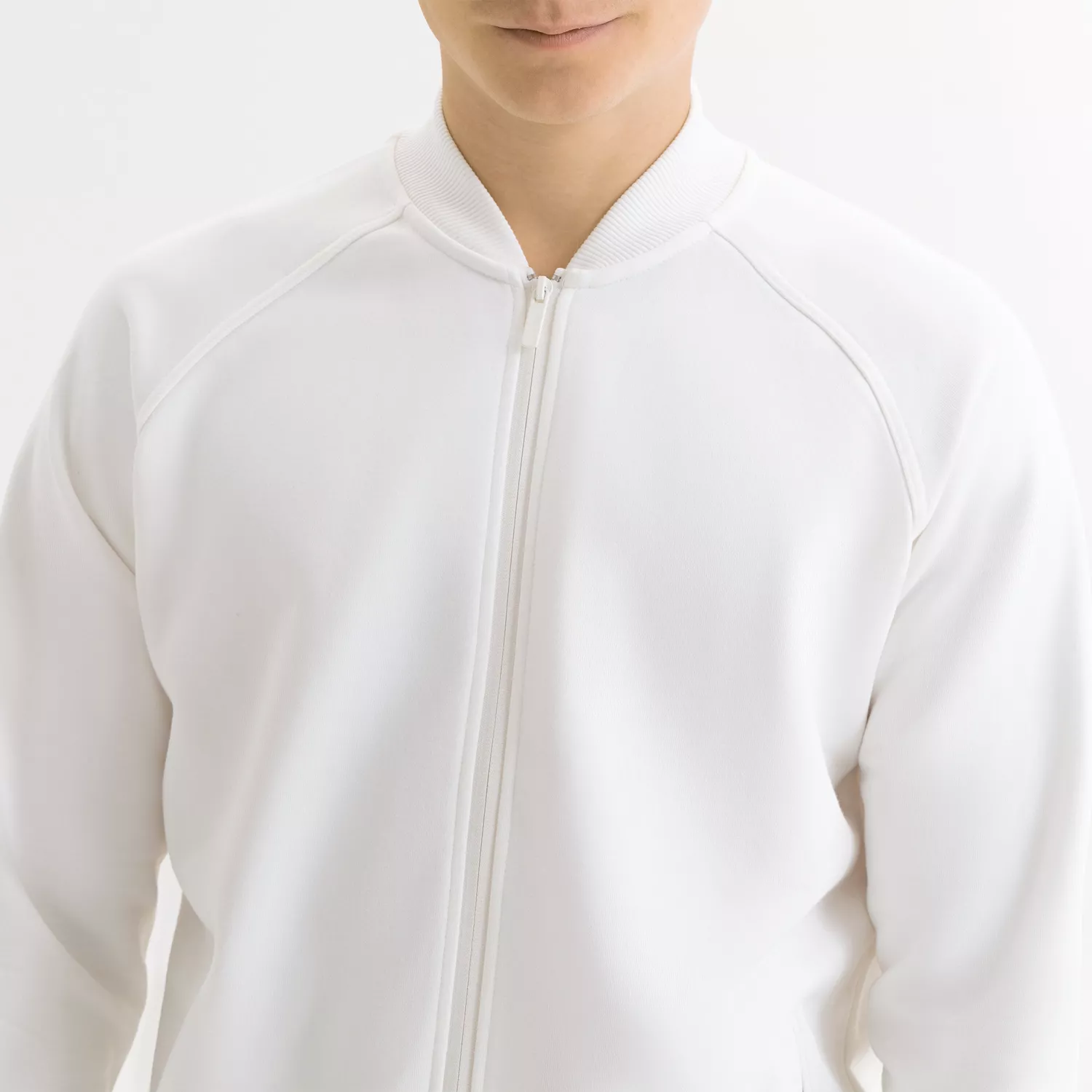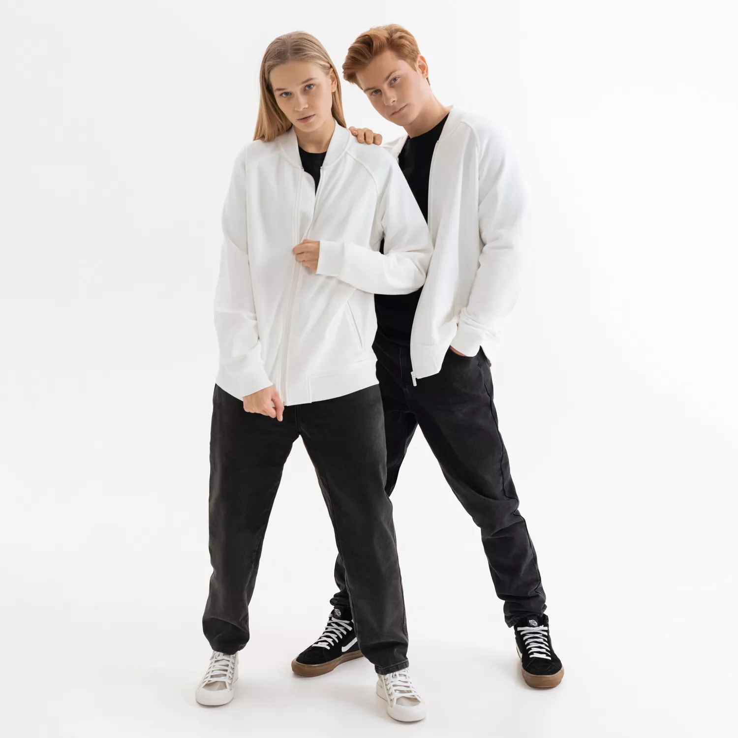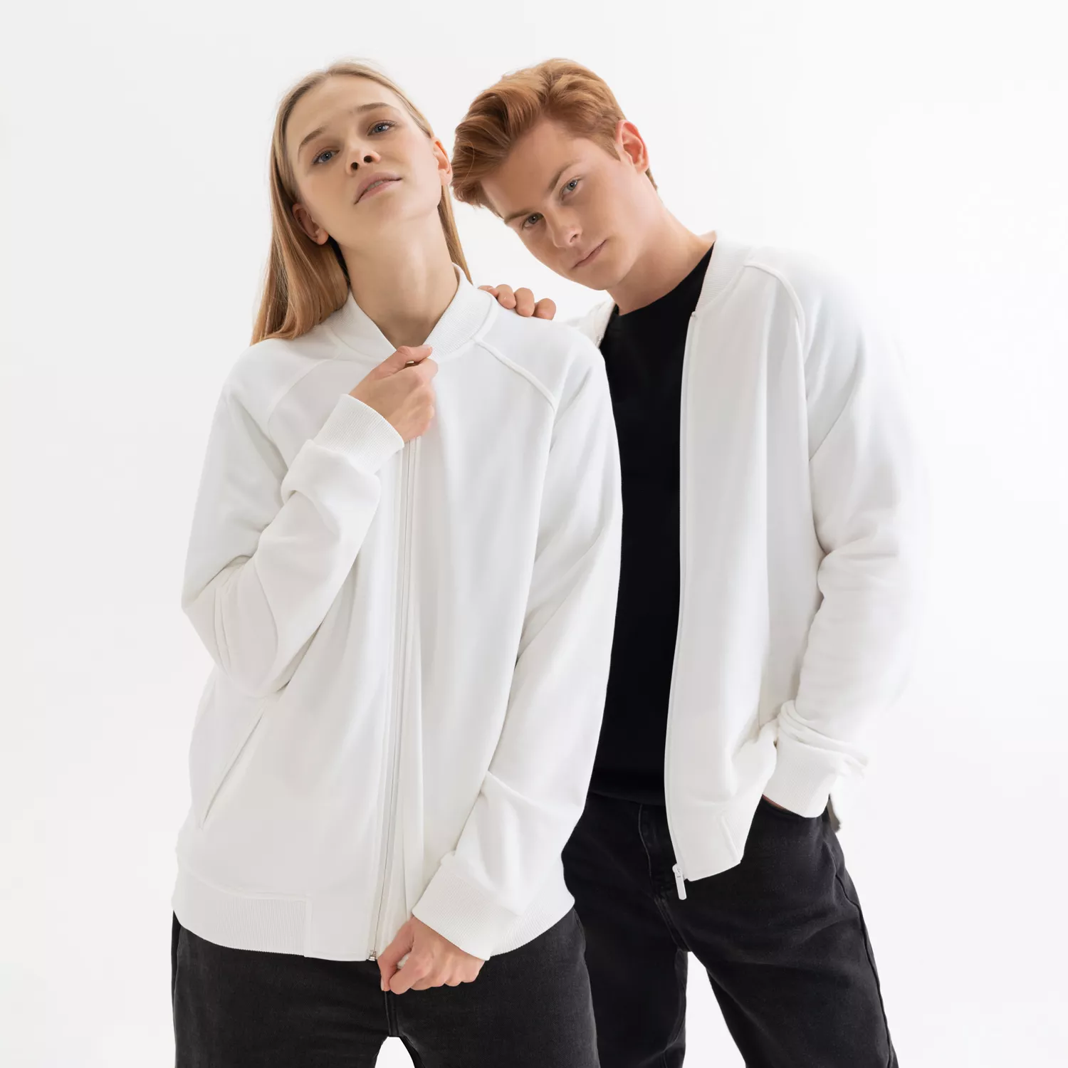 Стильная толстовка бомбер унисекс на реверсной молнии свободного силуэта с прорезными карманами в рамку.