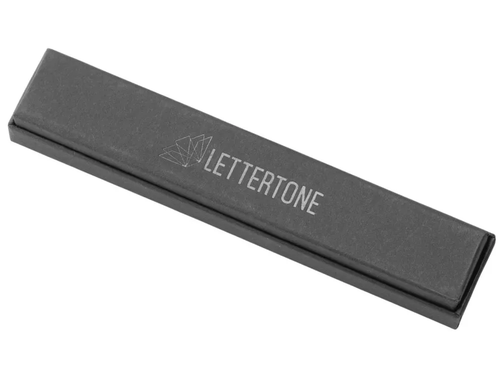 Ручка упакована в чёрный матовый футляр с логотипом бренда Lettertone на дне.