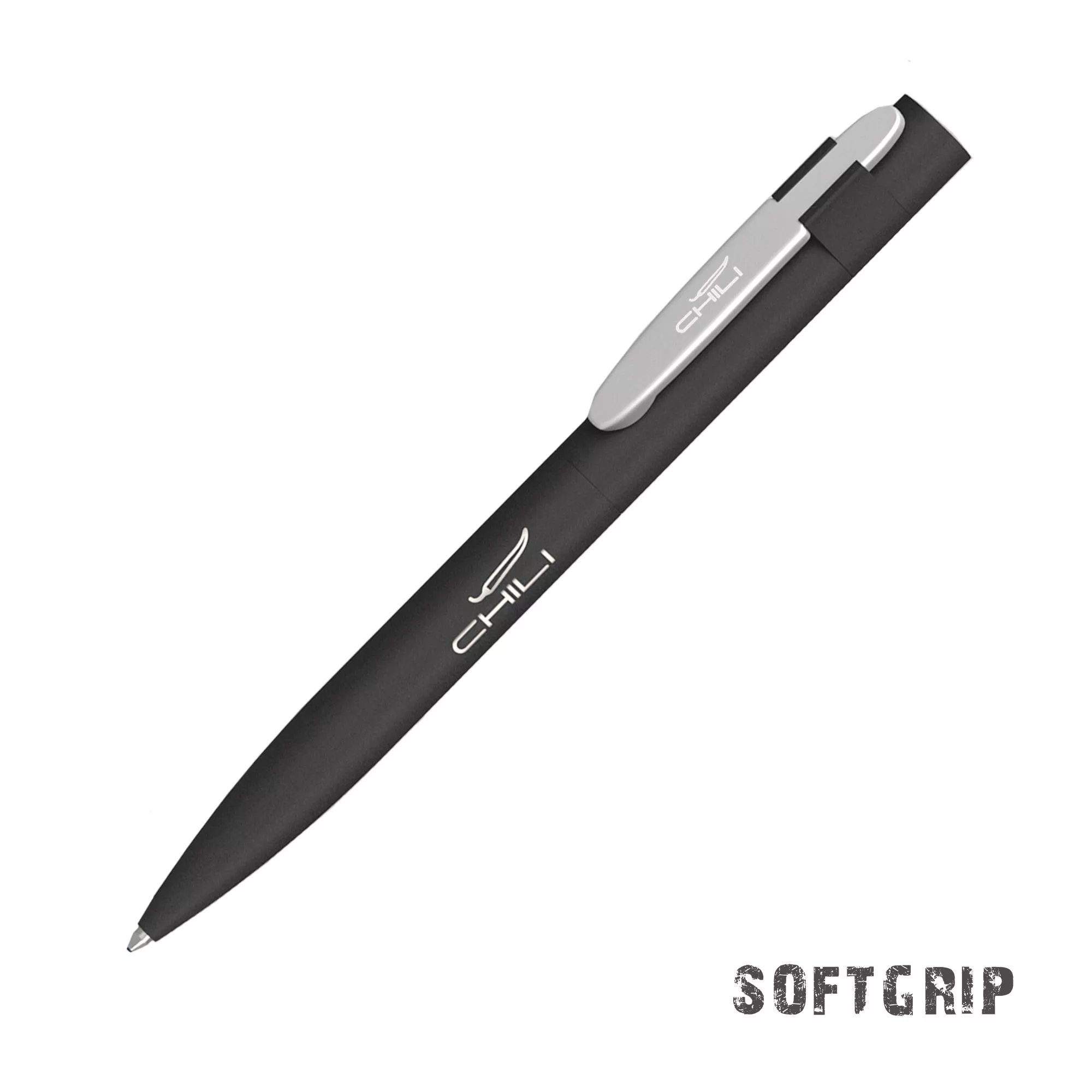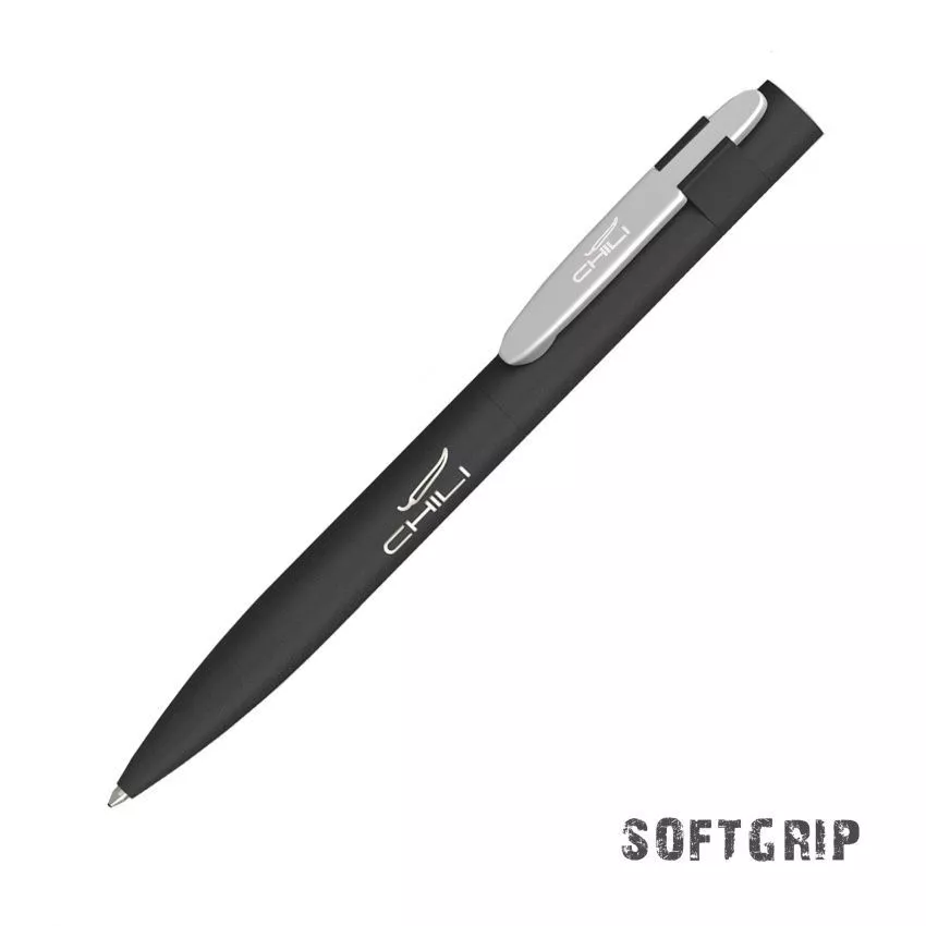 Оригинальное сочетание черного корпуса ручки в покрытии SOFTGRIP, обеспечивающем лёгкий массажный эффект, c цветным металлическим матовым клипом.