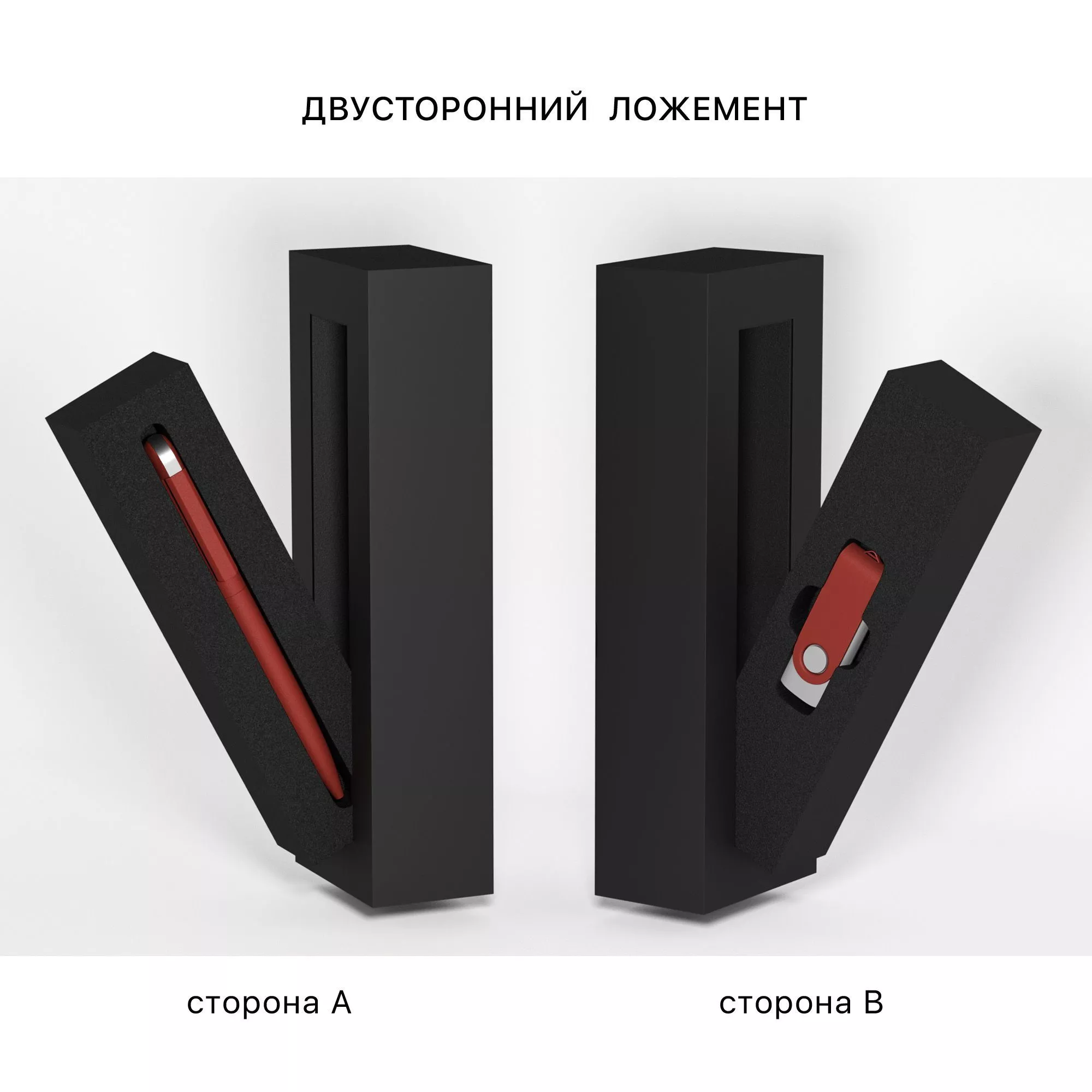 Бестселлер коллекции CHILI - Набор ручка "Jupiter" + флеш-карта "Vostok" в оригинальном футляре-конструкторе из материала EVA. Особого внимания заслуживает конструкция упаковки - комплектующие набора укладываются в двусторонний ложемент, который также можно персонализировать методом гравировки (газовый СО-лазер). Футляр закрыт шубером из черного картона. Рекомендуем посмотреть 3D-фото для детального представления об устройстве упаковки.