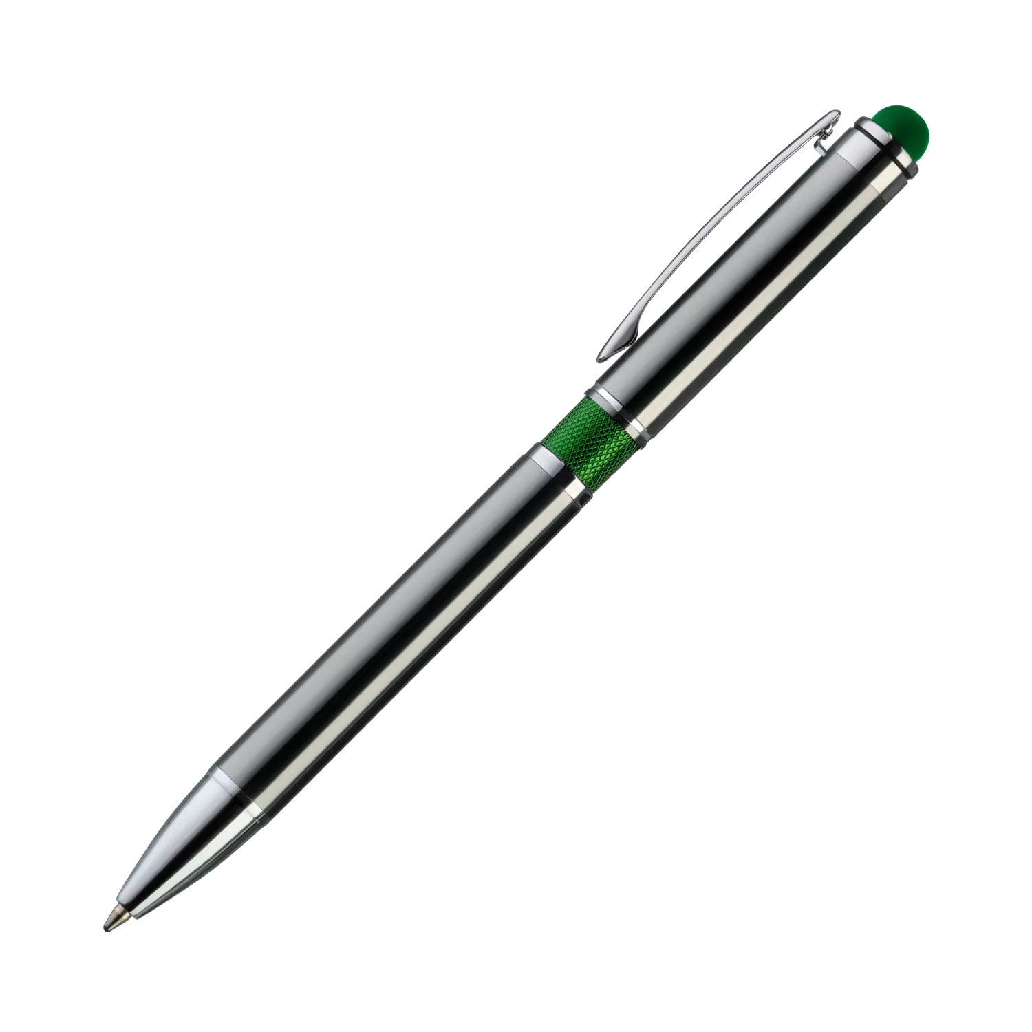 Классическая ручка цвета металлик с цветными деталями. Оснащена стилусом для работы с сенсорными экранами.