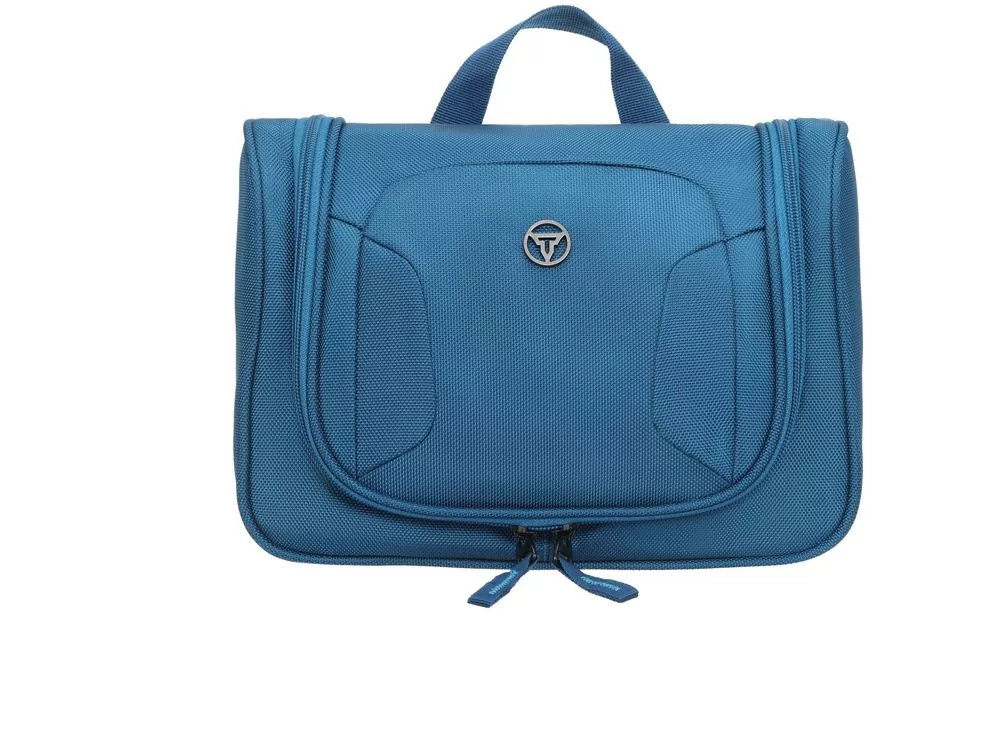 Несессер выполнен из высокопрочного полиэстера в синем цвете, обладает устойчивостью к различным загрязнителям и относительной влагонепроницаемостью. Основное отделение имеет широкий клапан на молнии с двумя бегунками. Несессер содержит 6 различных по назначению и объёму внутренних отделений на молнии и 4 эластичных держателя. С внешней стороны расположены эргономичная ручка для переноски и крючок для подвешивания несессера