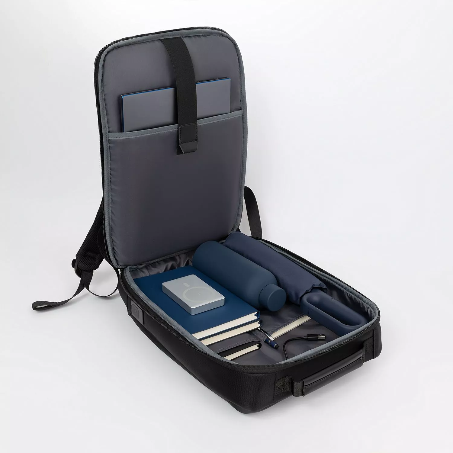 Ноутбук разместится в глубоком кармане внутри основного отделения рюкзака, также предусмотрены два небольших кармашка для мелочей. Основное отделение закрывается на двойную молнию. С лицевой стороны вместительный карман на молнии. На спинке широкая багажная лента для закрепления на ручке чемодана и потайной карман на молнии. Лямки — широкие, регулируемые по длине. Они хорошо облегают плечи и равномерно распределяют нагрузку.