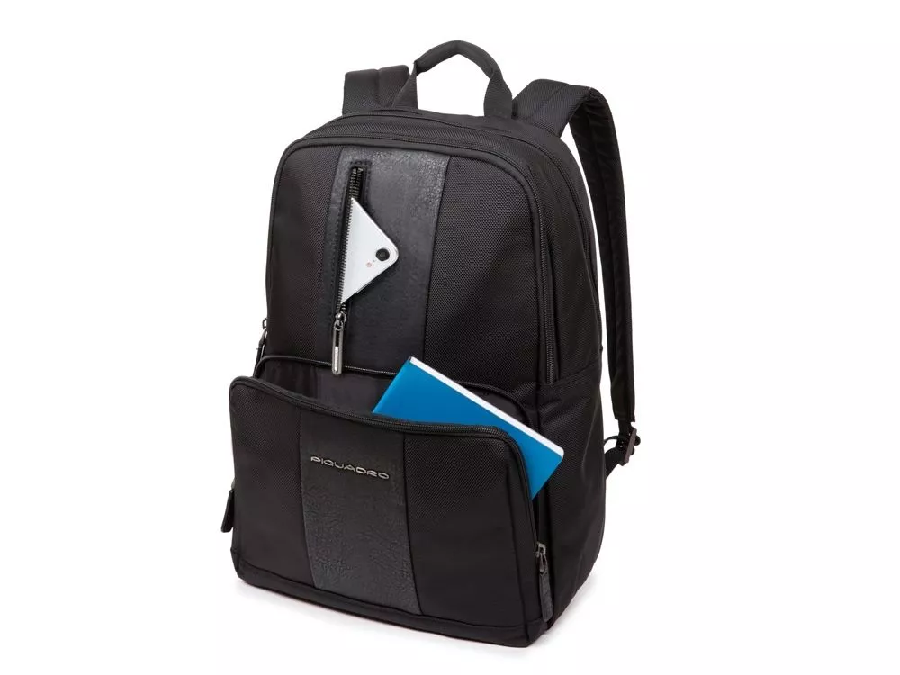 Снаружи, на задней стенке — ремень, позволяющий надеть рюкзак на ручку чемодана, а на передней — удобный вместительный карман для мелочей. Внутри предусмотрен органайзер для пишущих принадлежностей.