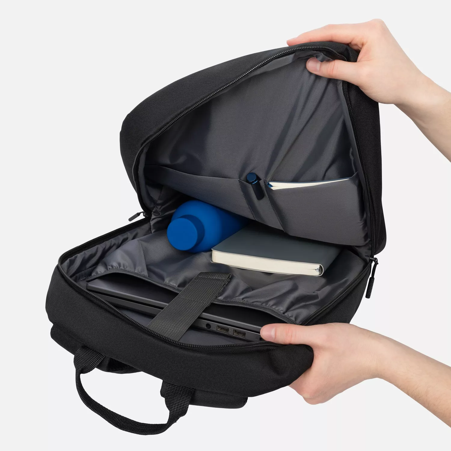 Основное отделение с легкостью вместит ноутбук с диагональю до 15,6 дюймов благодаря уплотненному карману, который защищен ремнем на липучке.