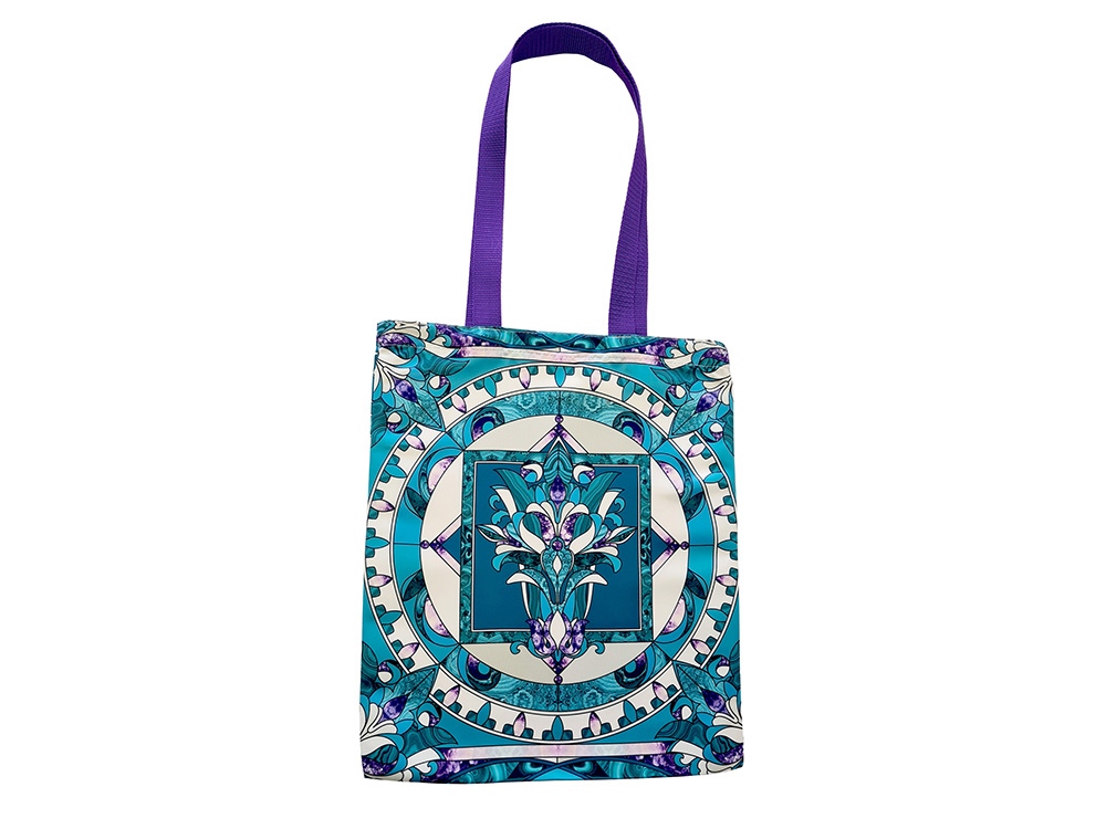 По мотивам сказов, в дизайне платка мозаика цветка Хозяйки содержит уральские самоцветные кристаллы аметиста и медного изумруда, по преданию наделенного исключительной магической силой. Цветок предстает в обрамлении каймы узорчатого малахита – символа Хозяйки горы и Урала в целом.