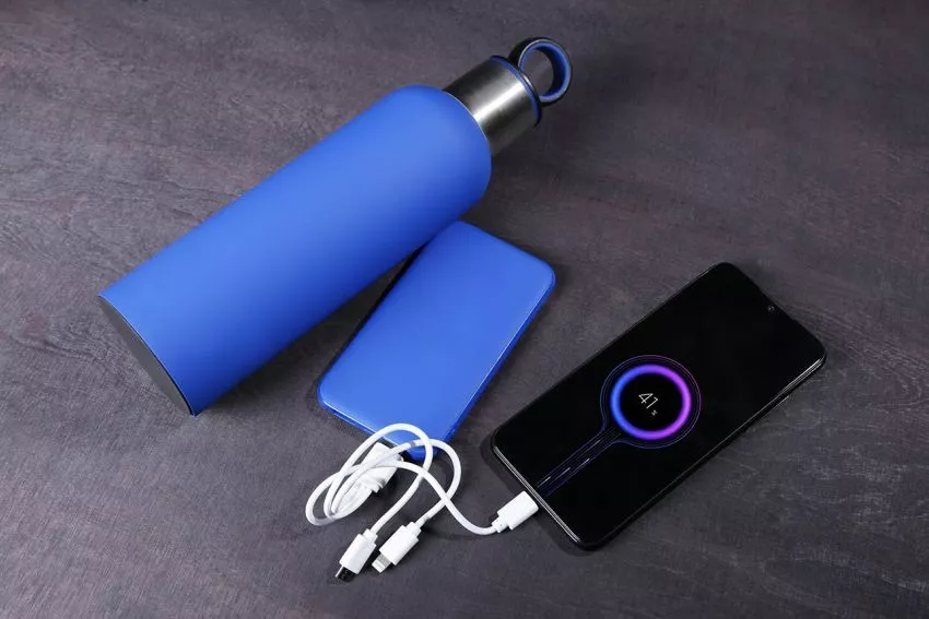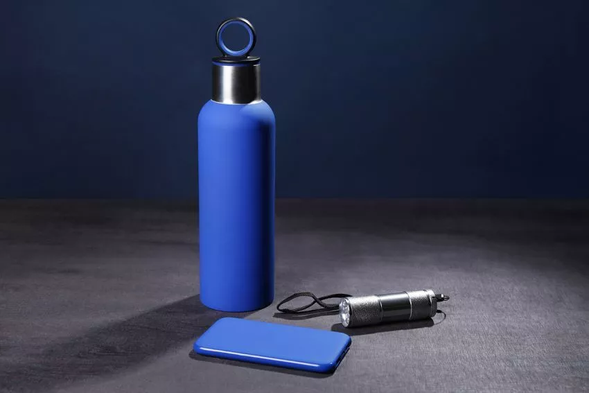 Краткое описание набора: внешний аккумулятор, бутылка для воды, фонарь светодиодный