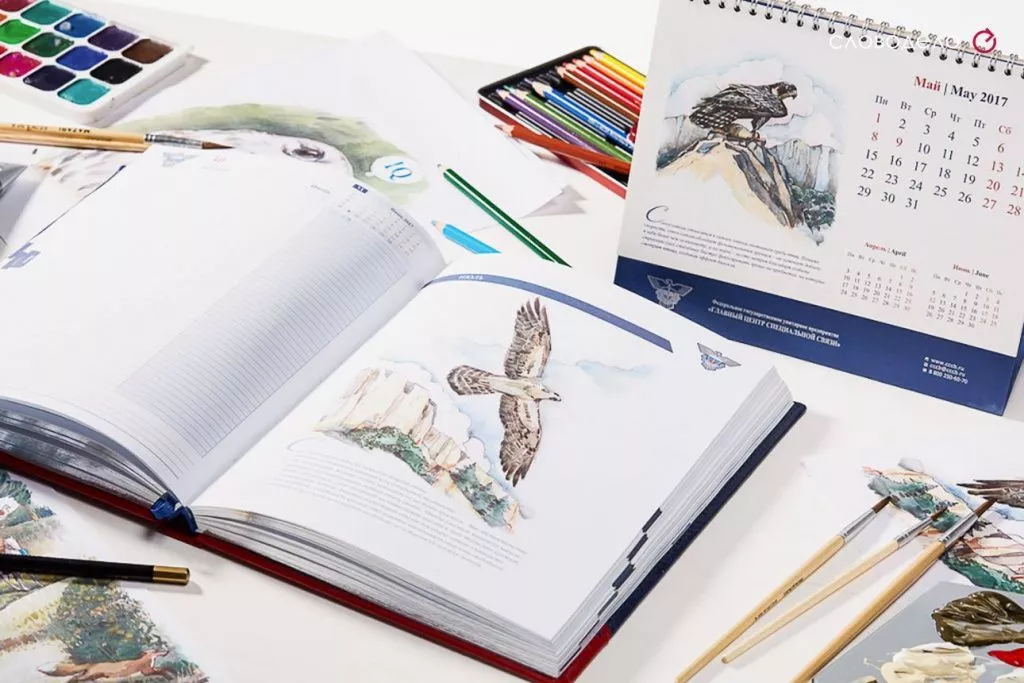 Для проекта были нарисованы иллюстрации птиц по запросу заказчика. Календарь домик из дизайнерской бумаги, тиснение и шелкография на обложке, блок из дизайнерской бумаги с иллюстрациями.