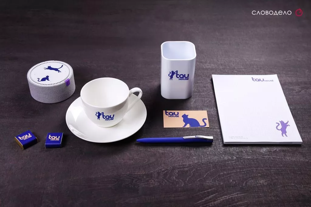 Жилой комплекс Tau House в Уфе группы компании Садовое кольцо. Был комплексный запрос для нового отдела продаж. Блокнот в фирменном стиле клиента, визитки, подставка для письменных принадлежностей с логотипом, ручка с логотипом, чайная пара + шоколадки в фирменной обертке для встреч с покупателями квартир в отделе продаж, также по желанию заказчика добавлена яндекс колонка и комплект наклеек для брендирования.