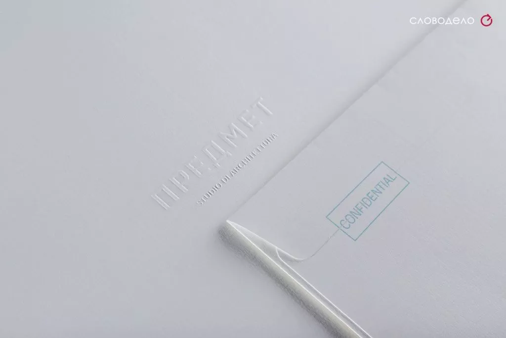 Дизайнерские бумаги и необычные способы печати были решением данной задачи. Конверты из фактурной бумаги с эффектом верже цвета слоновой кости с тиснением латунным клише, так как линии тонкие и высокие. На клапане шелкография «под штамп». Визитки с высокой печатью. Кашировка двух видов бумаг, на голубой стороне тиснение белой фольгой.