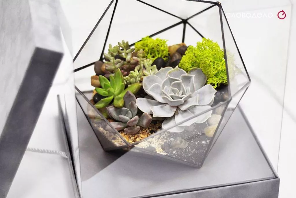Оригинальный подарок с настольным мини садом, который не завянет и будет долго радовать обладательницу подарка. Сад упакован в невесомую прозрачную коробку с ручками из витого шнура. Основа и крышка выполнена из текстурной бархатной бумаги. На крышке брендирование – логотип компании.