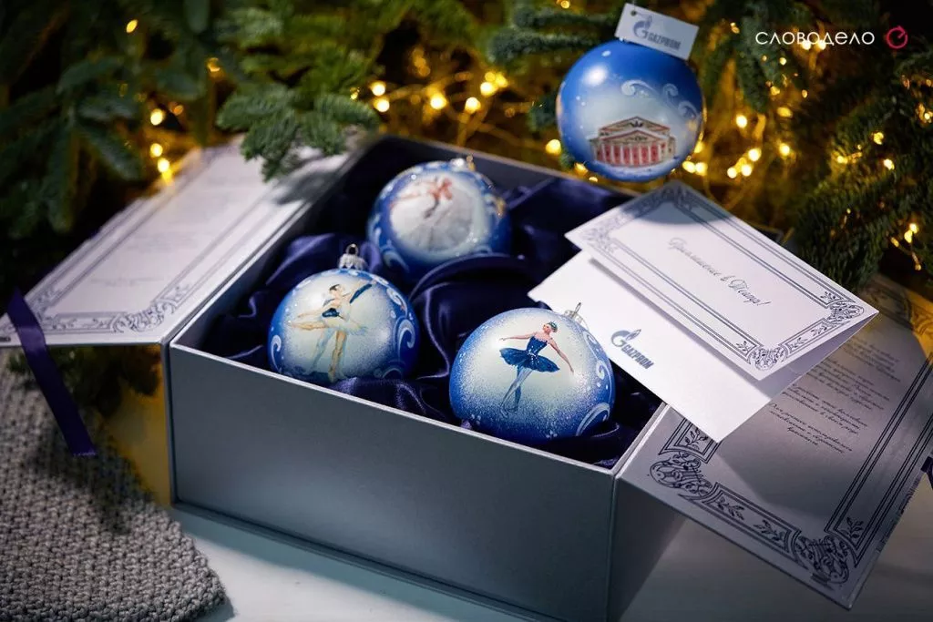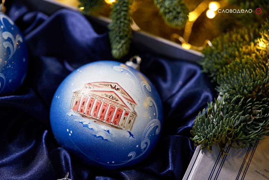 Новогодние игрушки на елку всегда ценный и приятный подарок! Особенно когда они эксклюзивные. Шары стеклянные с ручной росписью. На них изображен Большой театр и балерины. Подарочная коробка выполнена в виде самого Большого театра, закрывается на бантик из репсовых лент. Ложемент под шары украшен темно-синей атласной тканью. Сама коробка кашированная с печатью шелкографией фирменным пантоном. Дополнено открыткой с новогодним поздравлением.