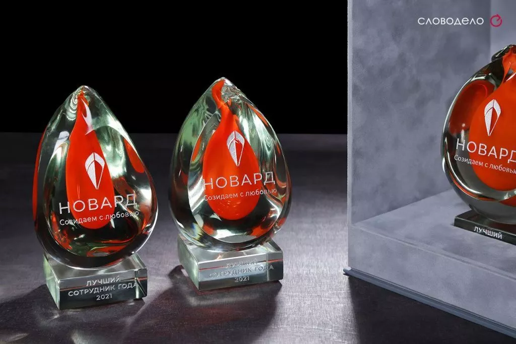 Каждый сотрудник уникален, поэтому и награды решили сделать из стекла ручной работы, чтобы каждая получилась уникальной. Сочетание прозрачного и цветного (фирменный цвет клиента) стекла с гравировкой логотипа и номенации. Такую награду будет приятно сохранить и использовать в качестве украшения интерьера. Для награды изготовлена серая (также фирменный цвет клиента) коробка из тактильной бумаги очень приятной на ощупь + бархатной бумаги. Предусмотрено место для фиксации награды. Тиснение серебряной фольгой логотипа и ленточка для удобства открывания. Пакет в цвет коробки из плотной дизайнерской бумаги с ленточными ручками также с тиснением логотипа.