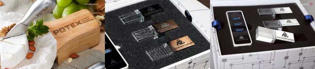 Применяется она на продукции, выполненной из широкого спектра материалов: кожи, металла, дерева, стекла, резины и даже некоторых видов пластика. С помощью лазера можно украсить как привычные бокалы, термосы, ручки, кружки и офисные принадлежности, так и спортивные трофеи, медали и наградные кубки. Такая памятная надпись или изображение лишь дополняют уникальный вид ценных вещей, не выглядя на них инородно, в отличие от толстого и неустойчивого слоя краски.